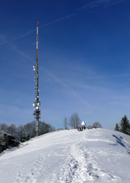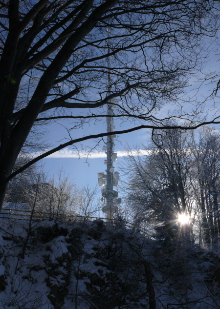 Nach steilem, teils recht rutschigem Anstieg ist endlich der Gipfel mit seinem riesigen Antennenaufbau in Sichtweite