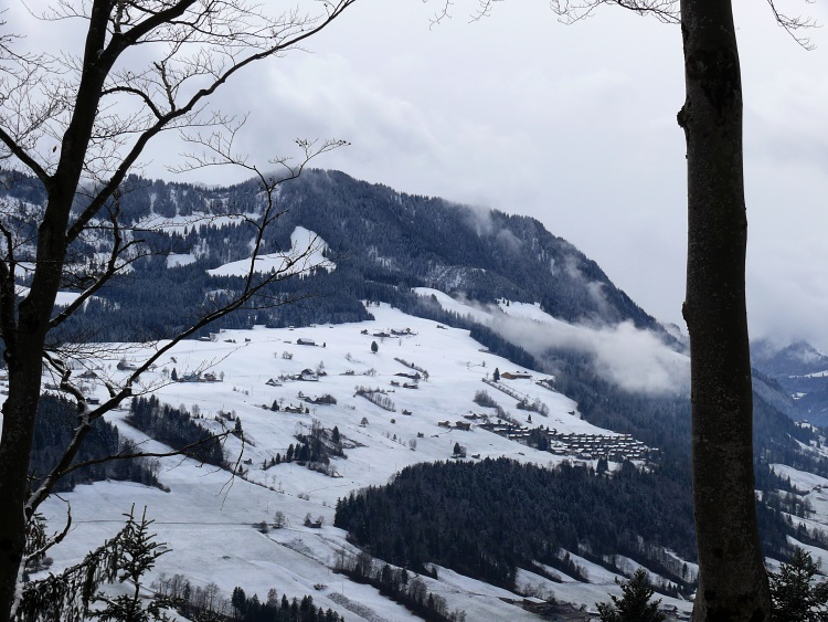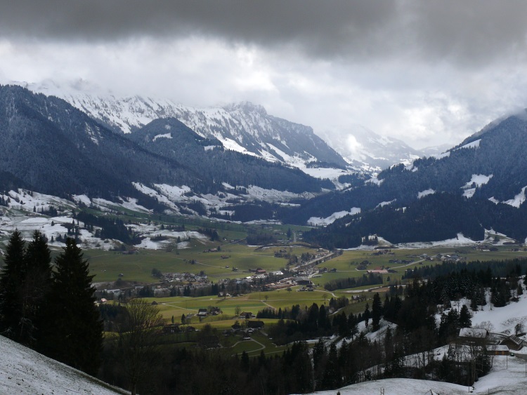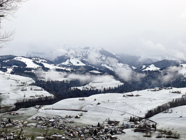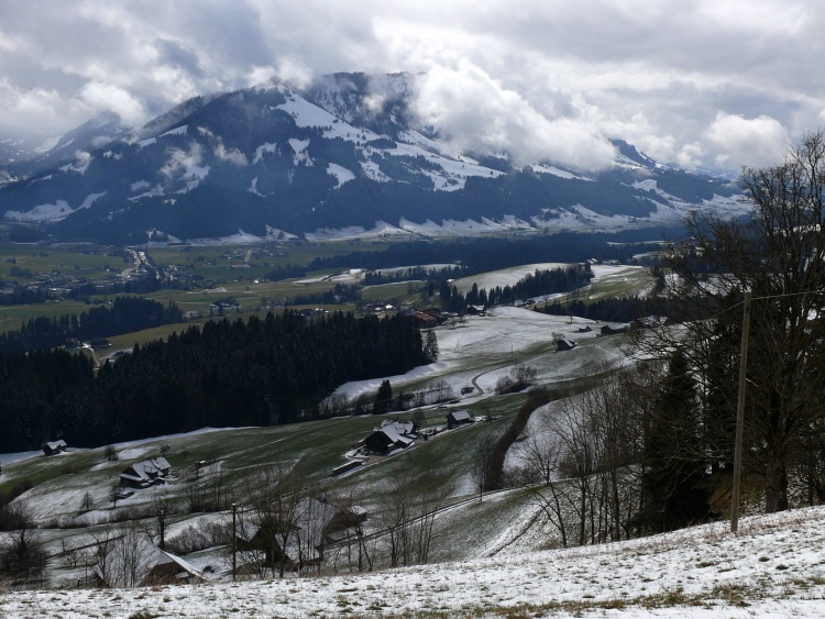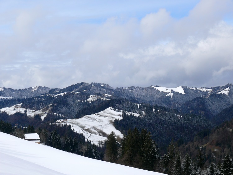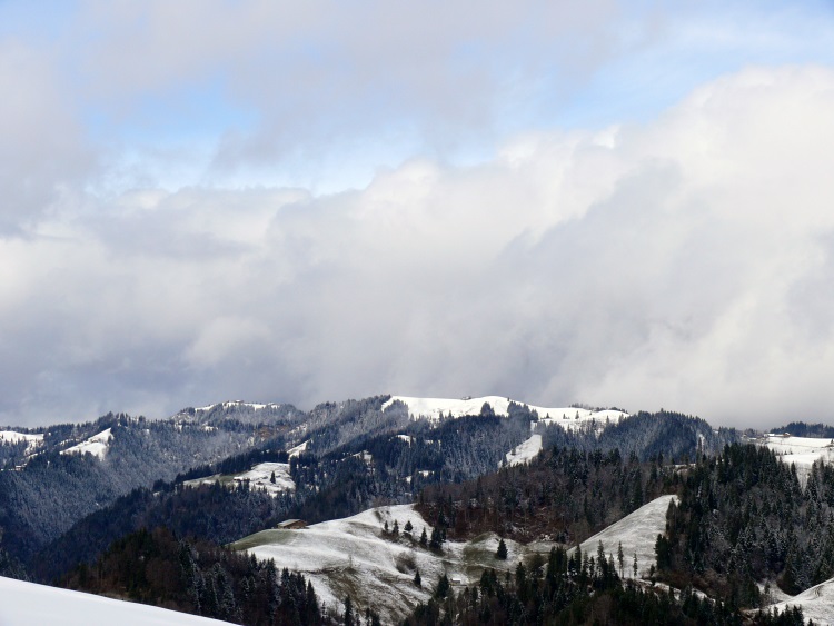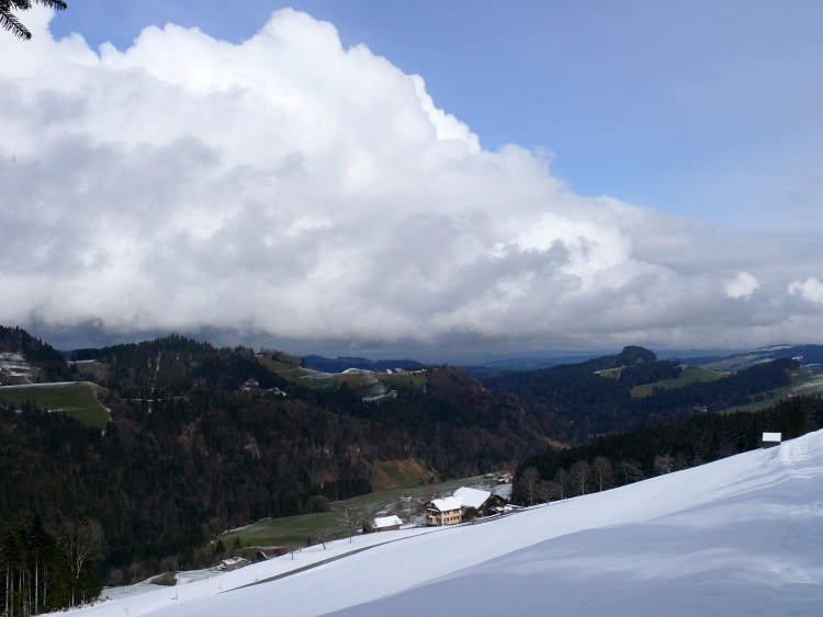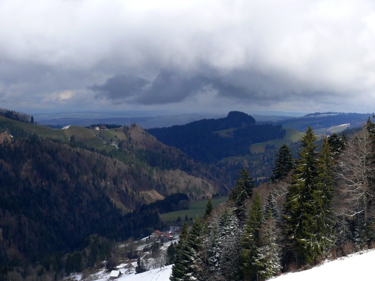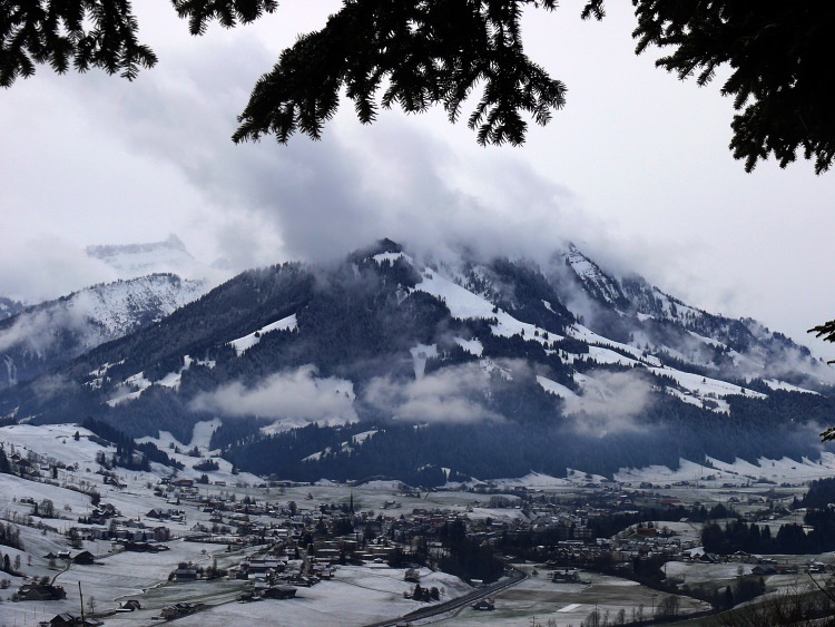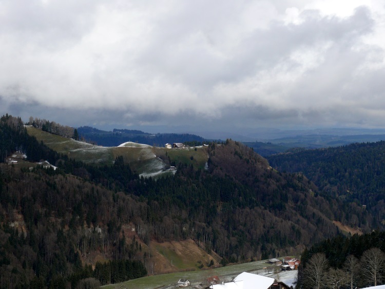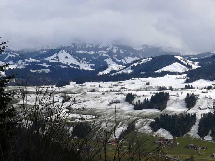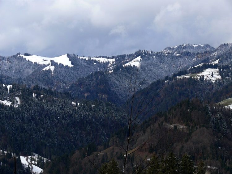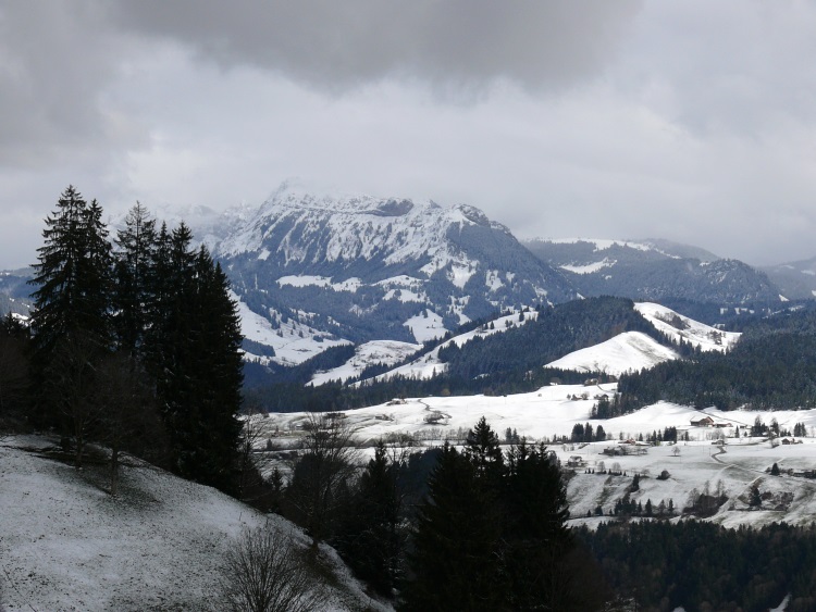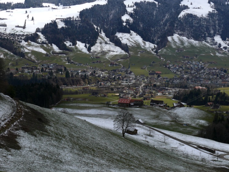 Blick vom Grat auf das frisch verschneite Hasle, dahinter der Farnere