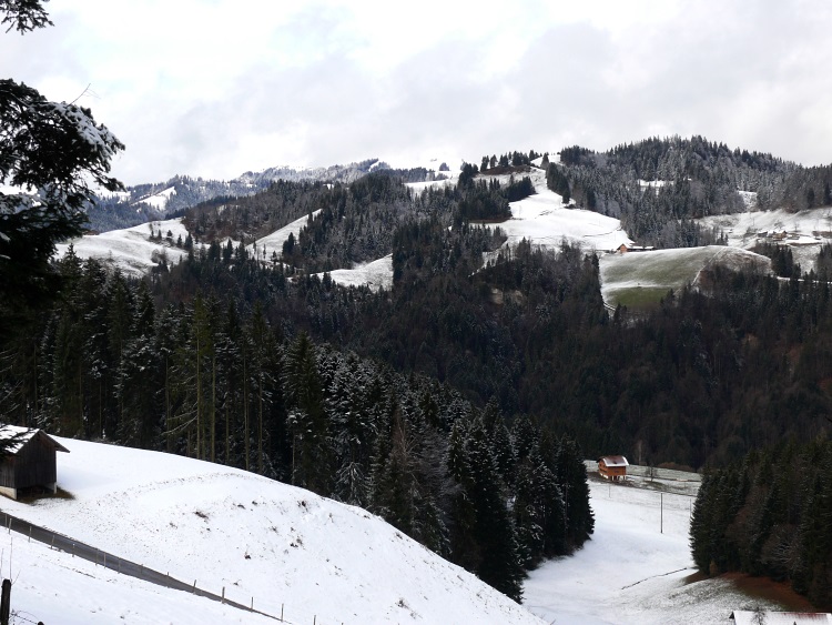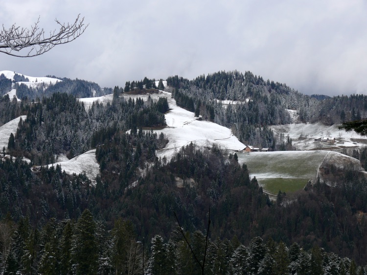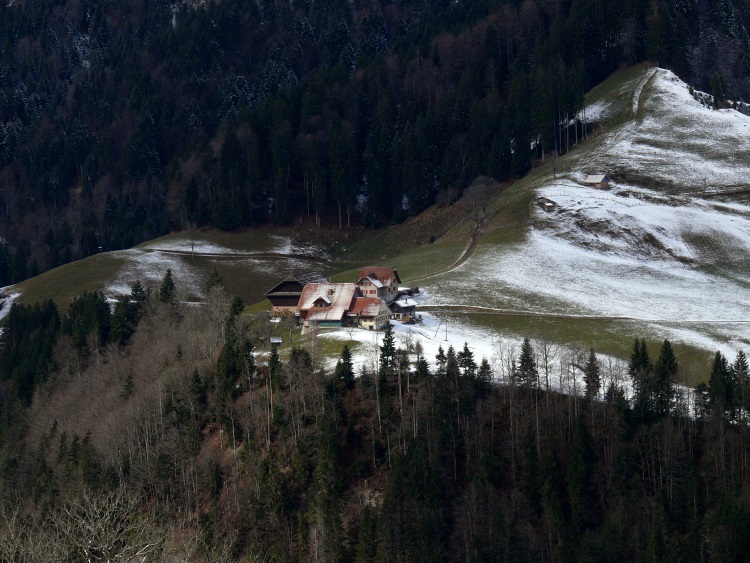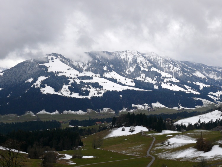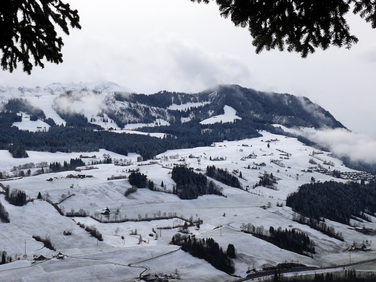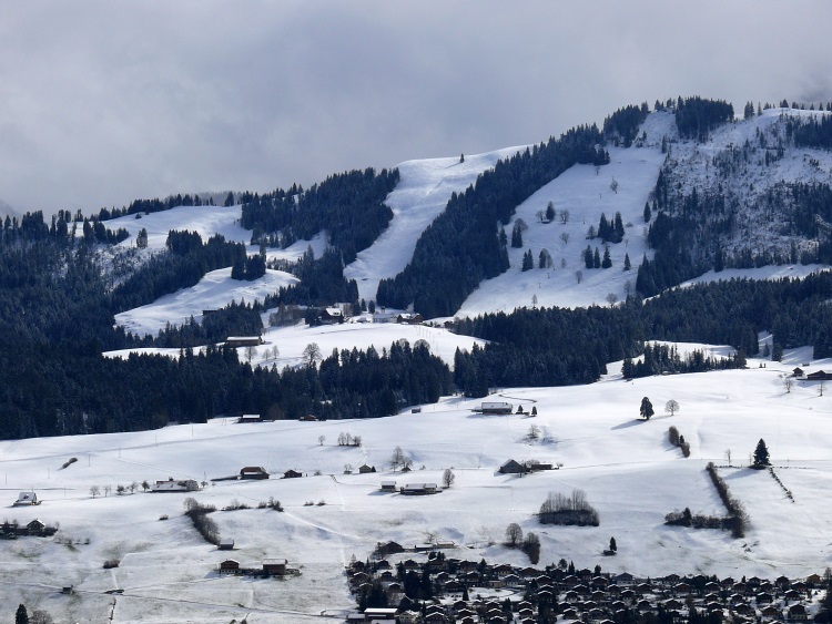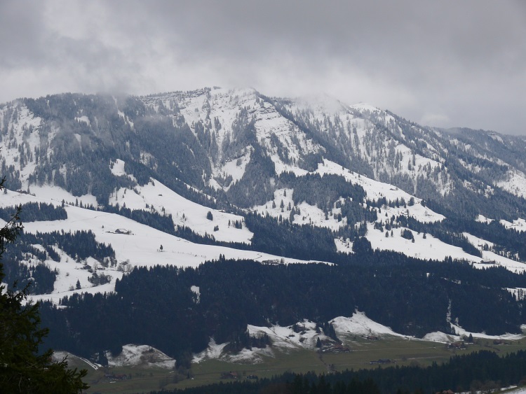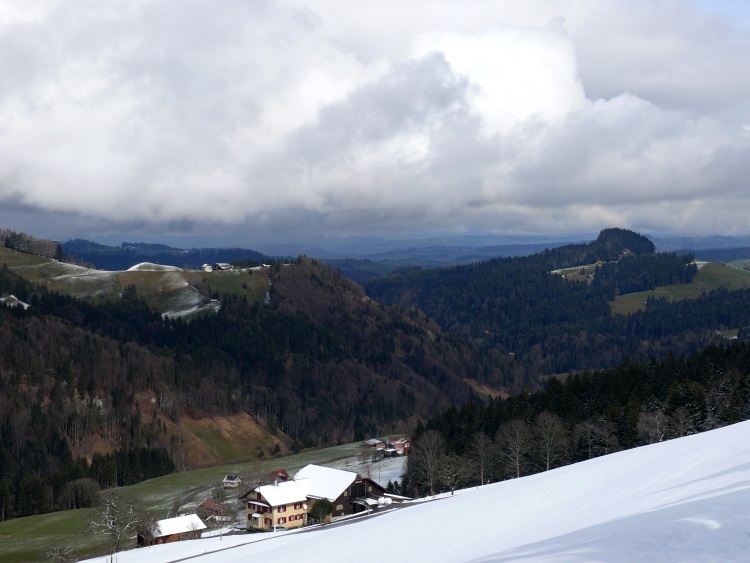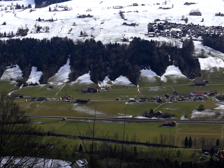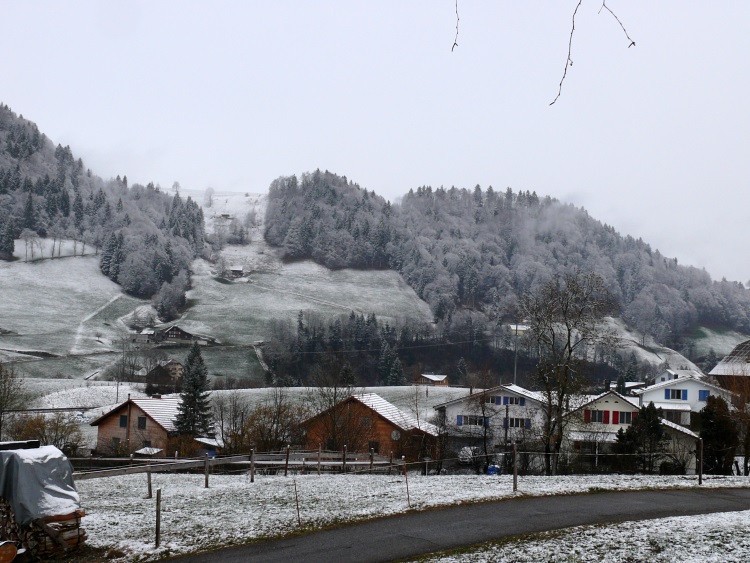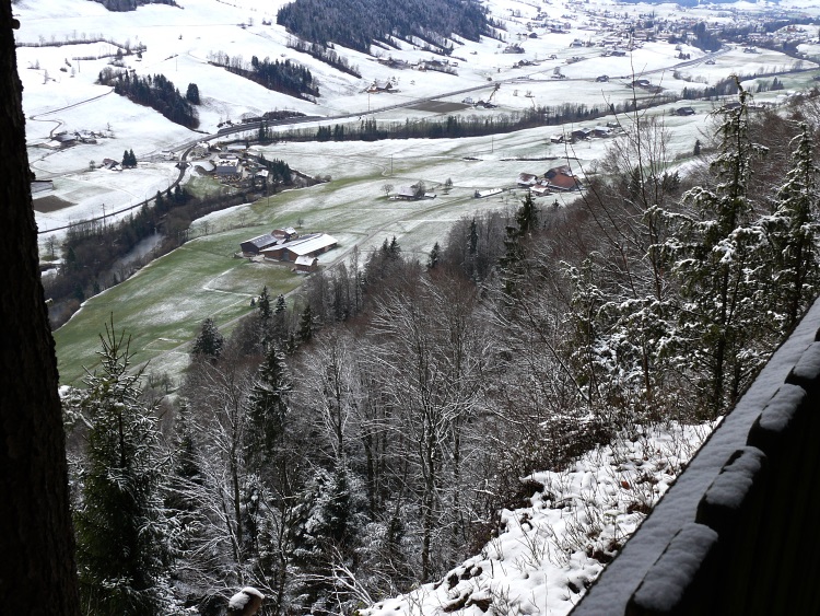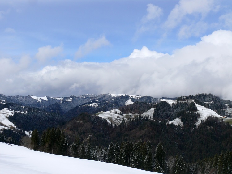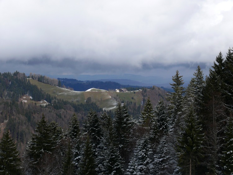 Blick vom Grat auf das frisch verschneite Hasle, dahinter der Farnere