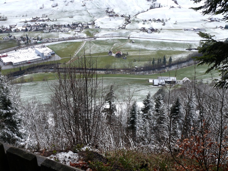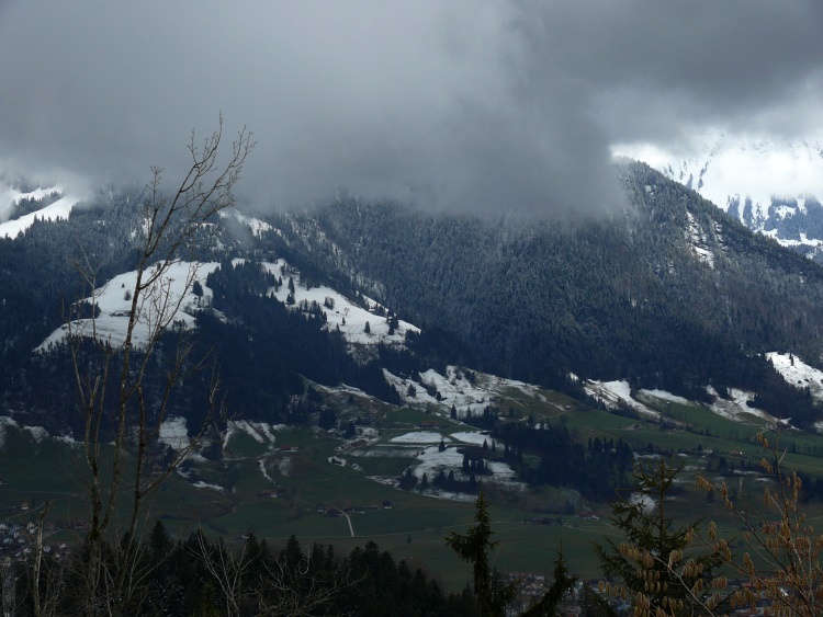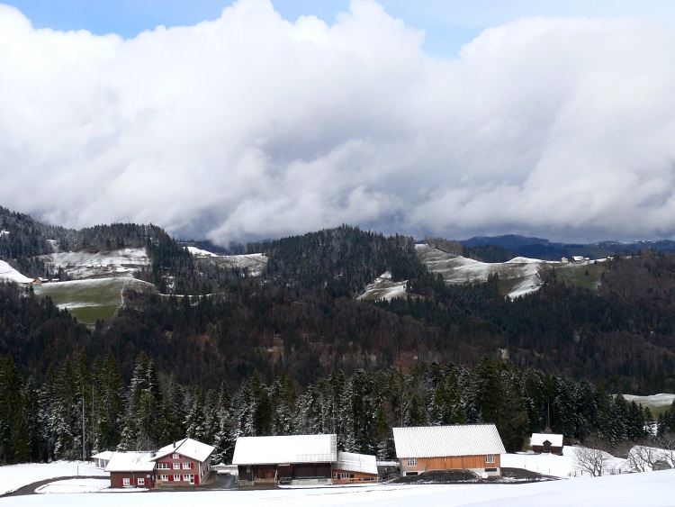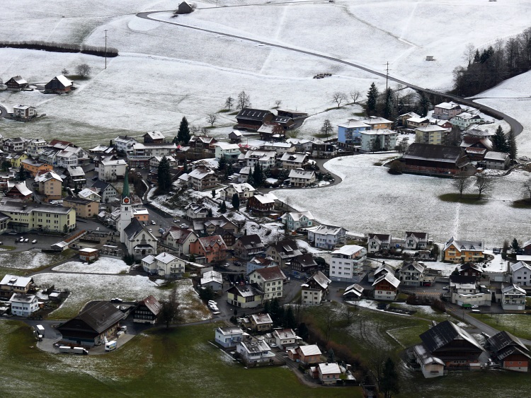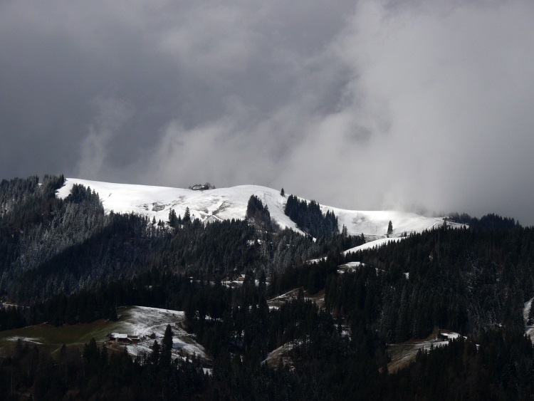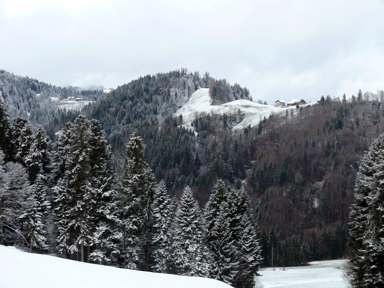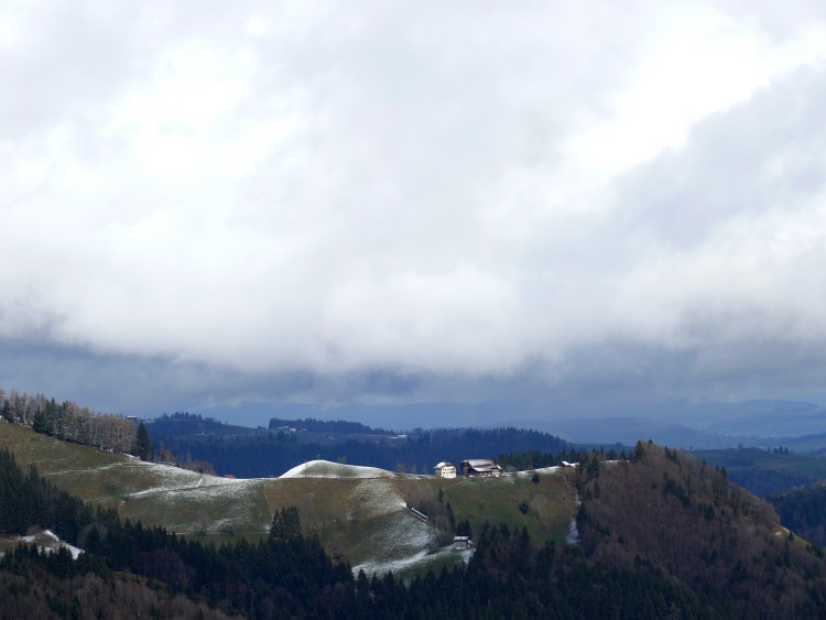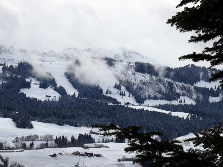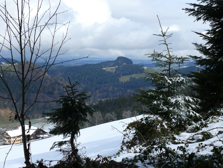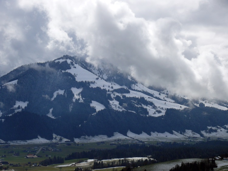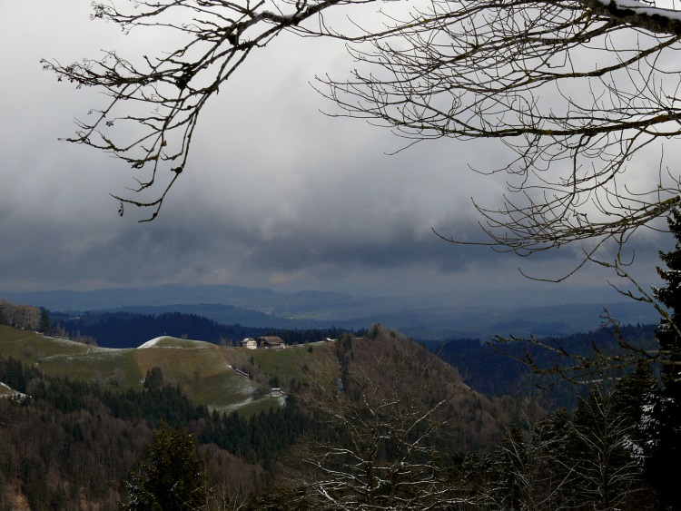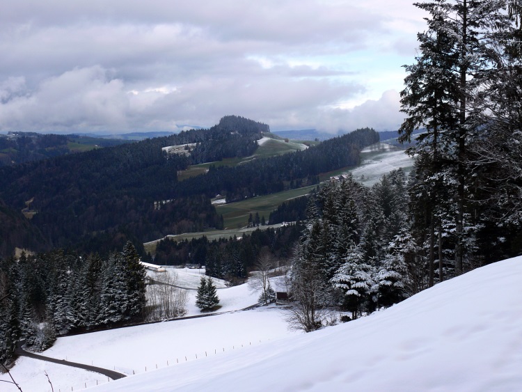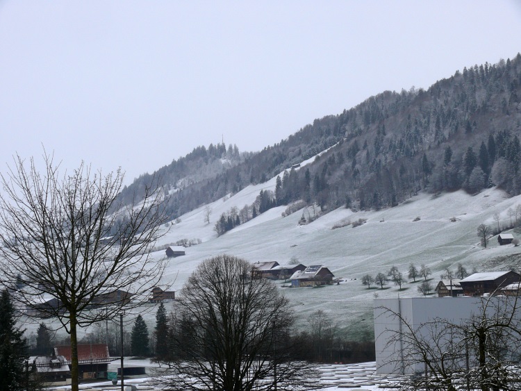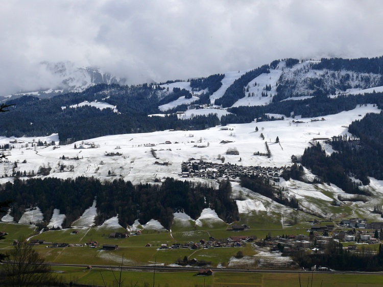 Blick vom Grat auf das frisch verschneite Hasle, dahinter der Farnere