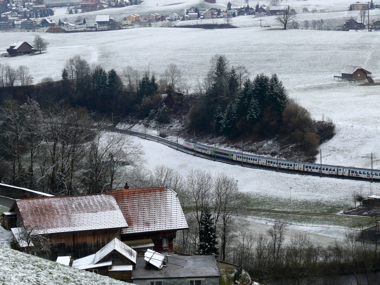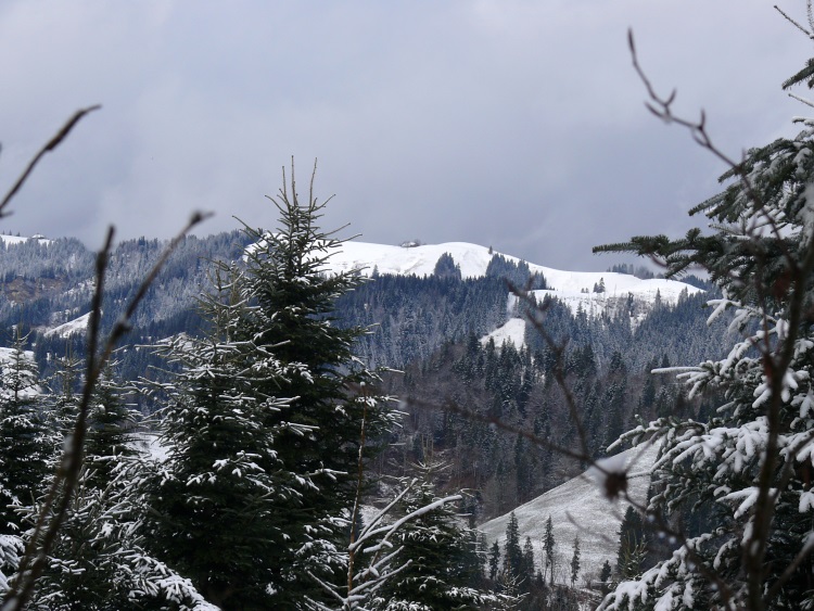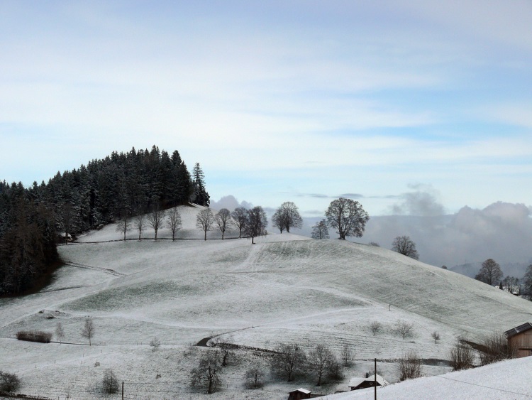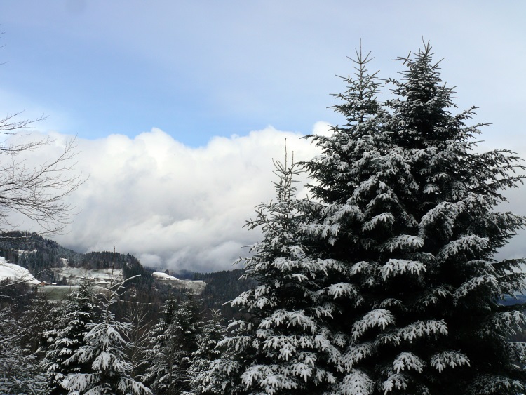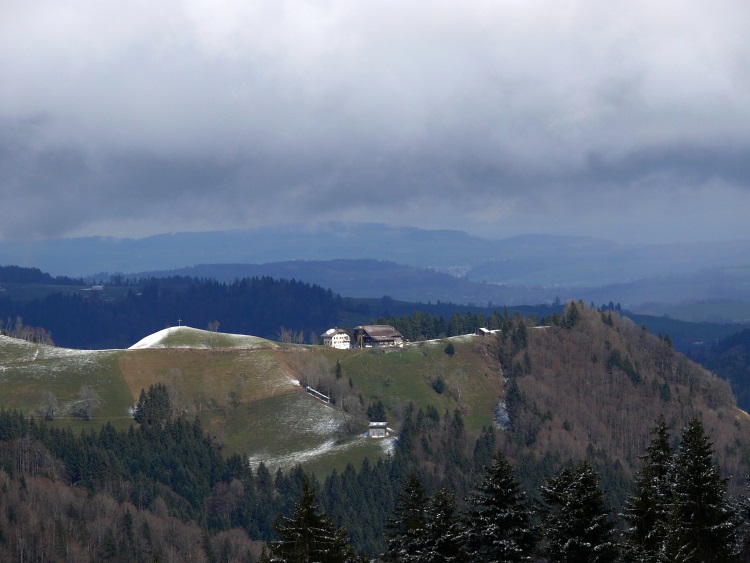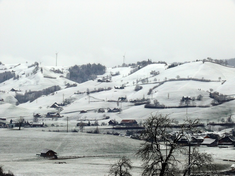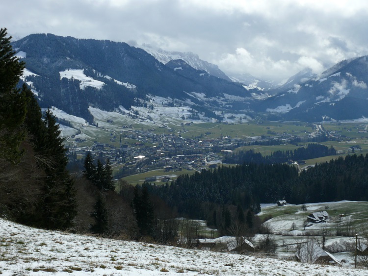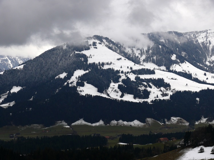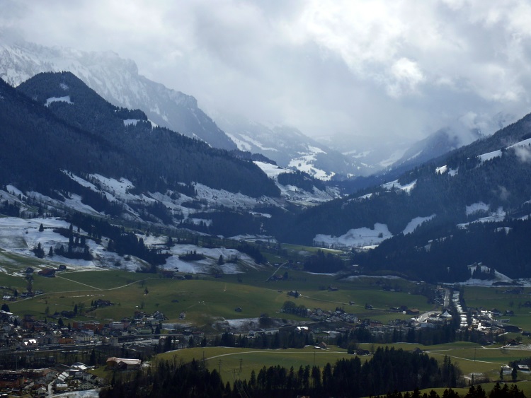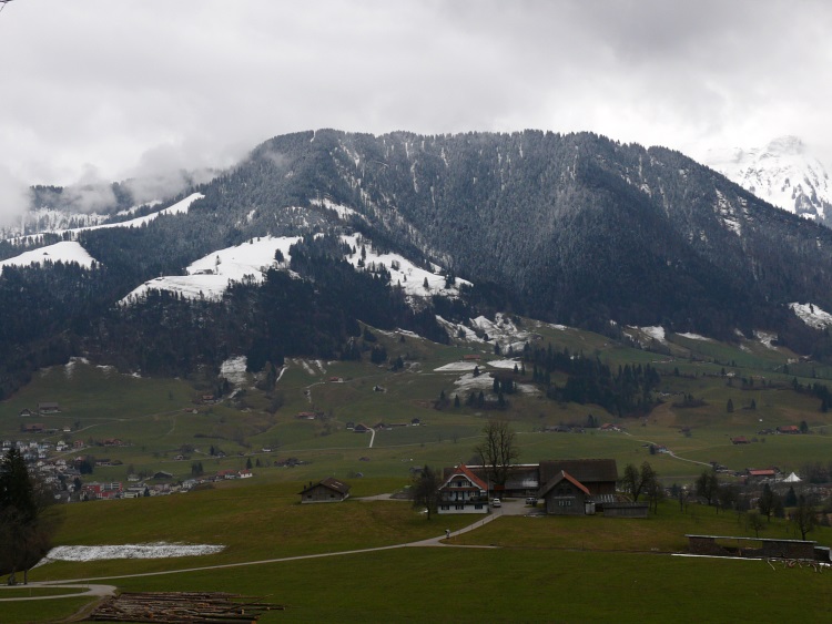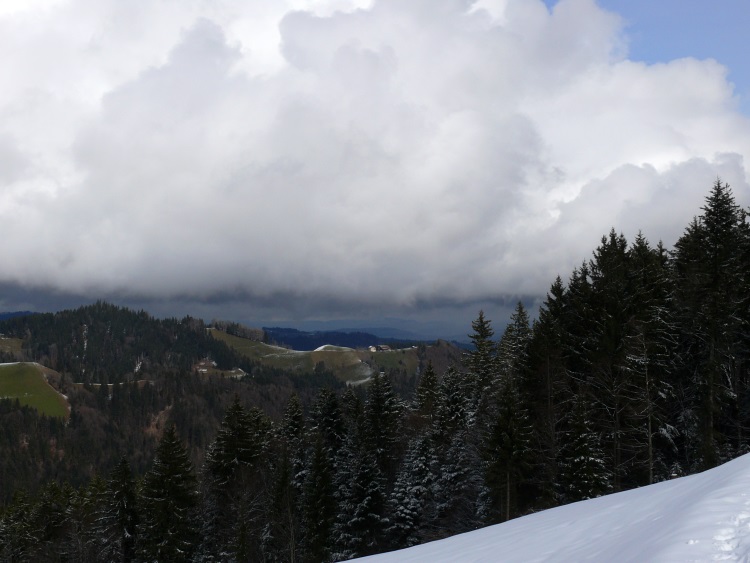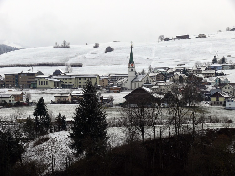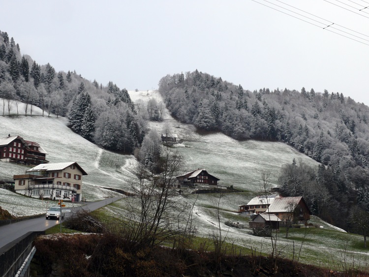 Blick vom Grat auf das frisch verschneite Hasle, dahinter der Farnere
