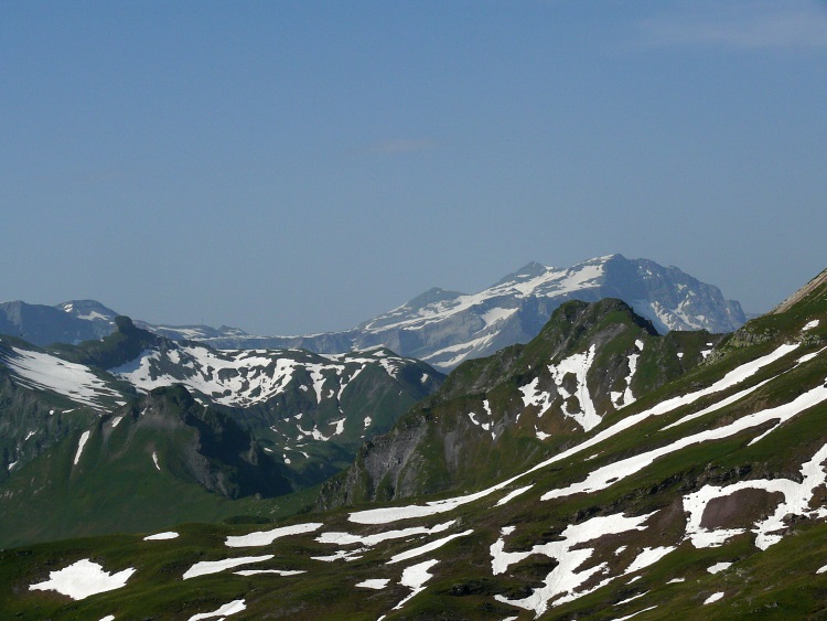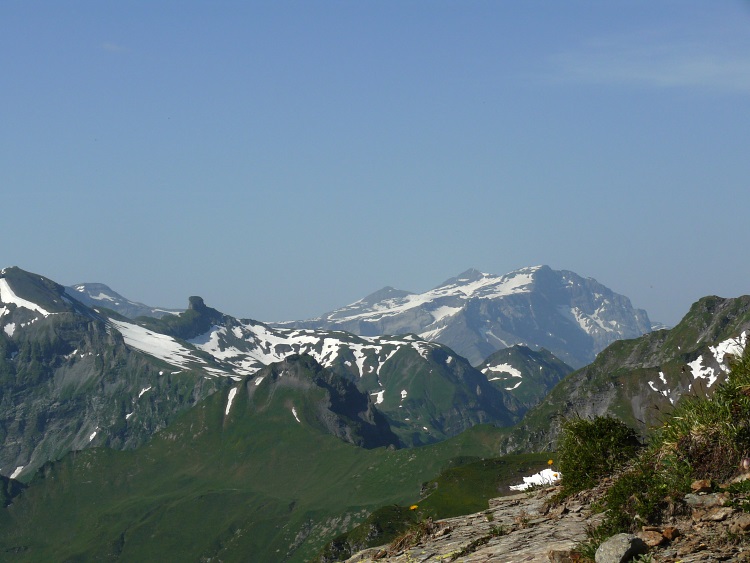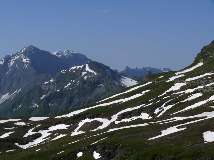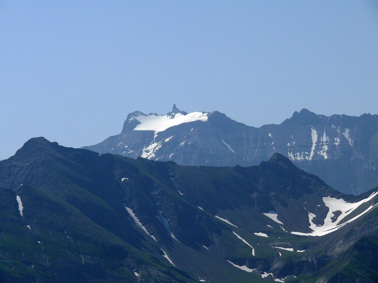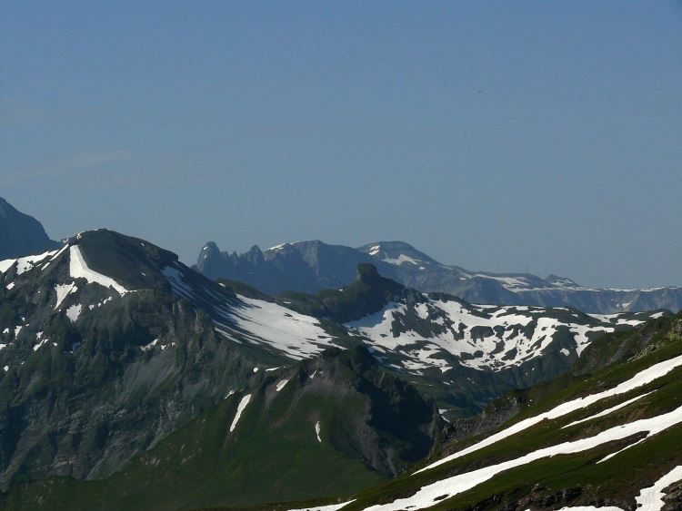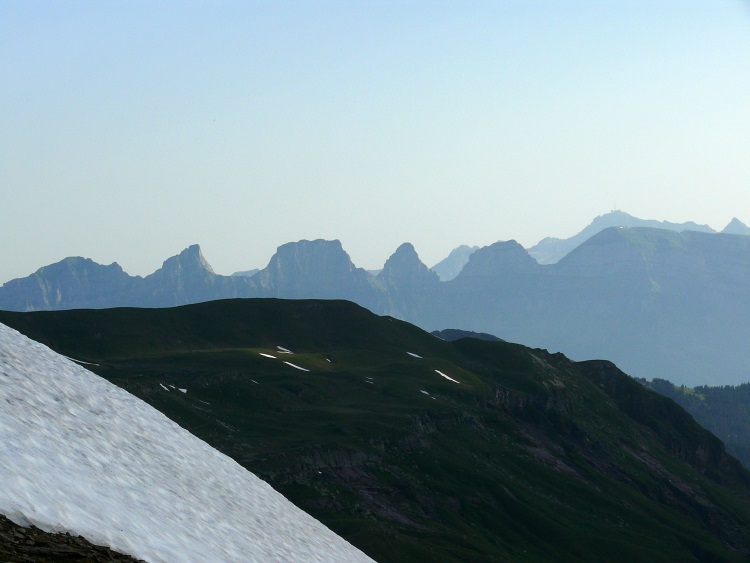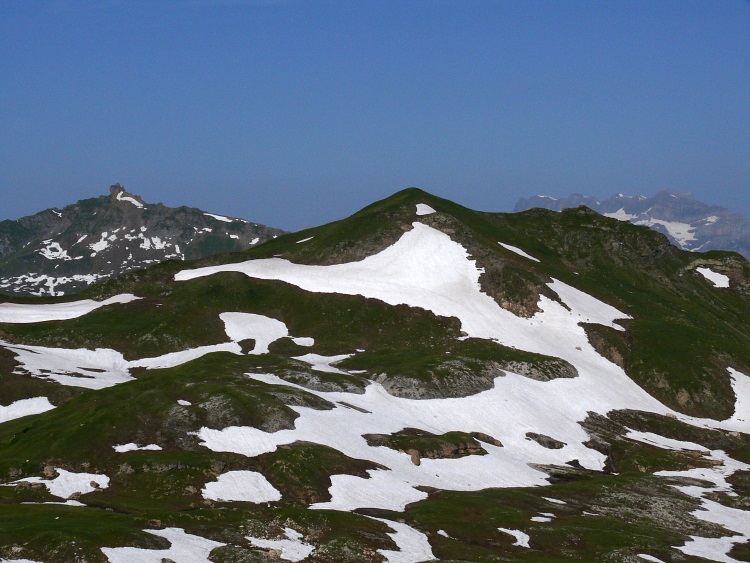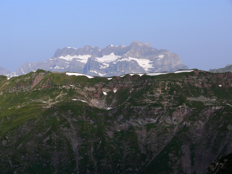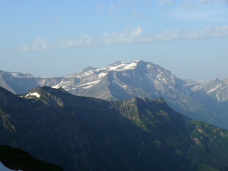Als prominentester, vergletscherter Gipfel grüßt natürlich der Tödi; knapp rechts davor und kaum als Gipfel erkennbar der schneefreie Gipfel des Kärpf, rechts im Hintergrund der Clariden, links neben dem Tödi vermutlich der Hausstock (mit dem großen Schneefeld)