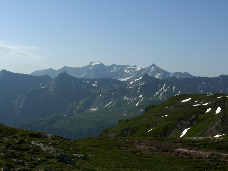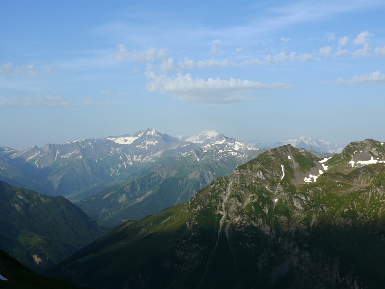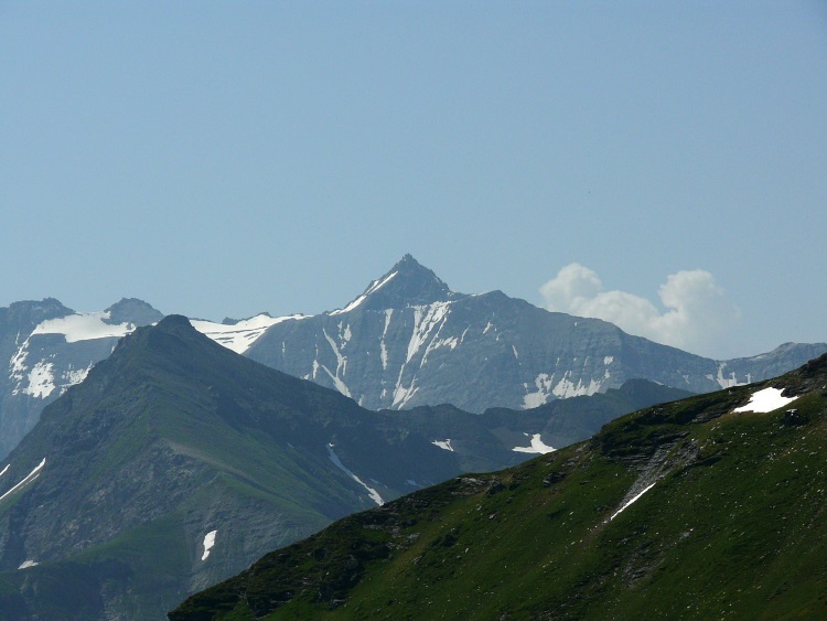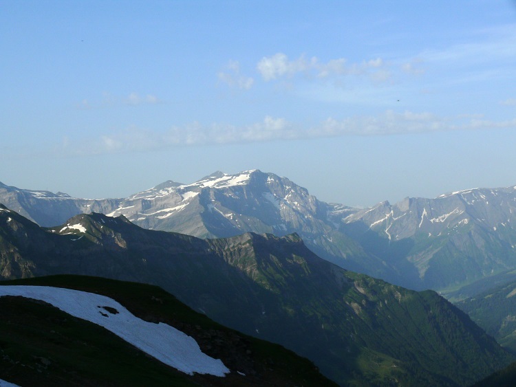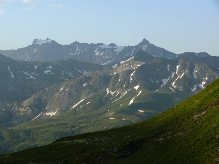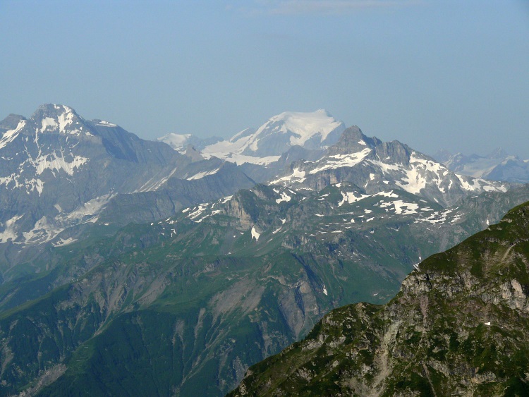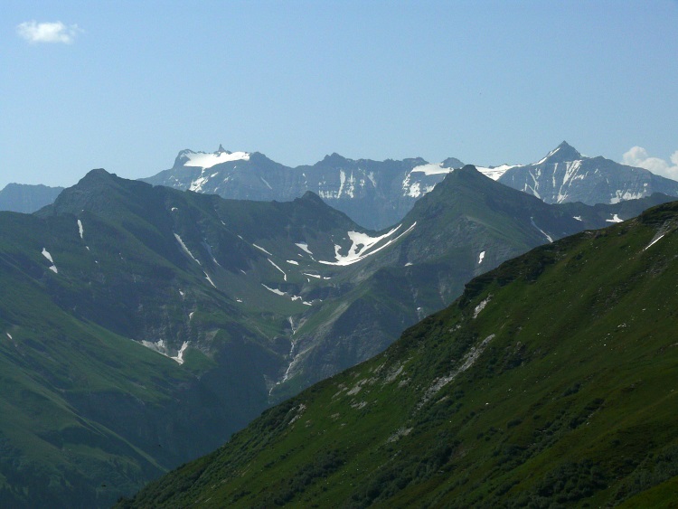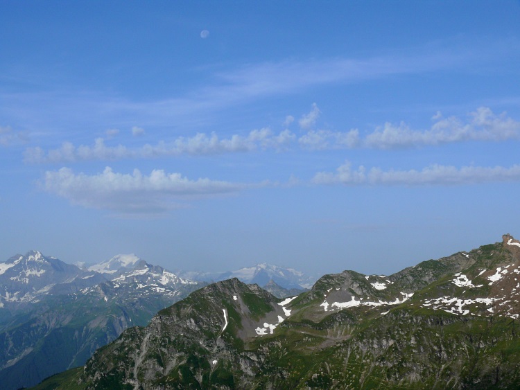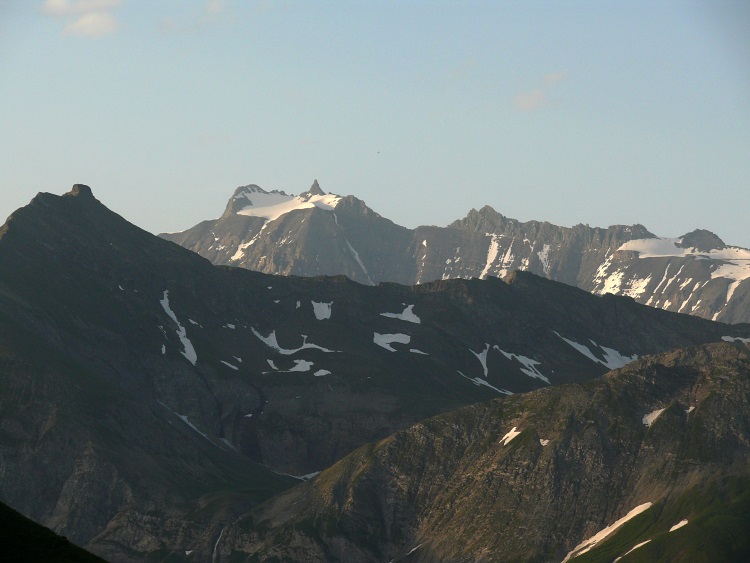 Als prominentester, vergletscherter Gipfel grüßt natürlich der Tödi; knapp rechts davor und kaum als Gipfel erkennbar der schneefreie Gipfel des Kärpf, rechts im Hintergrund der Clariden, links neben dem Tödi vermutlich der Hausstock (mit dem großen Schneefeld)