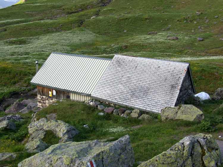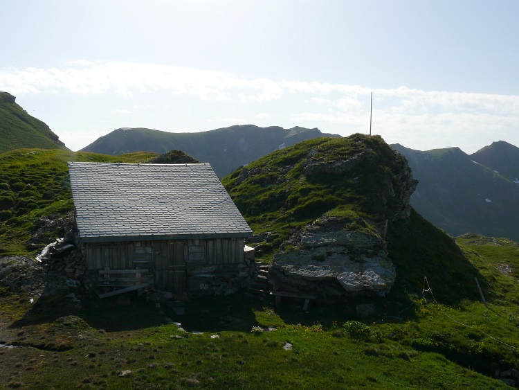 Unklar ist mir jedoch aus der Karte, ob ein solcher Abstieg problemlos möglich ist. Nichtsdestotrotz folge ich meinem Instinkt und gelange zunächst zum Prudellhüttli, wo ich hoffe, schon mal den Abstiegsweg zu Gesicht zu bekommen.