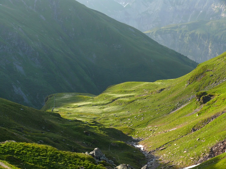 Blick hinunter von der Siezfurggla ins Tal der Alpe Obersiez-Säss
