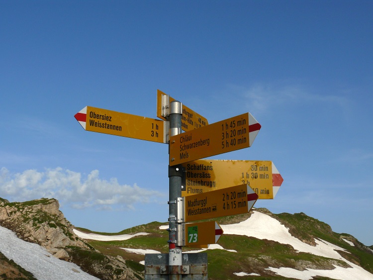 Bald danach ist auch der Passübergang (der hier gerne mit Furggla oder Furggel bezeichnet wird) erreicht: Wegweiser an der Fansfurggla