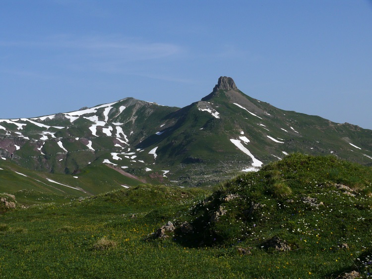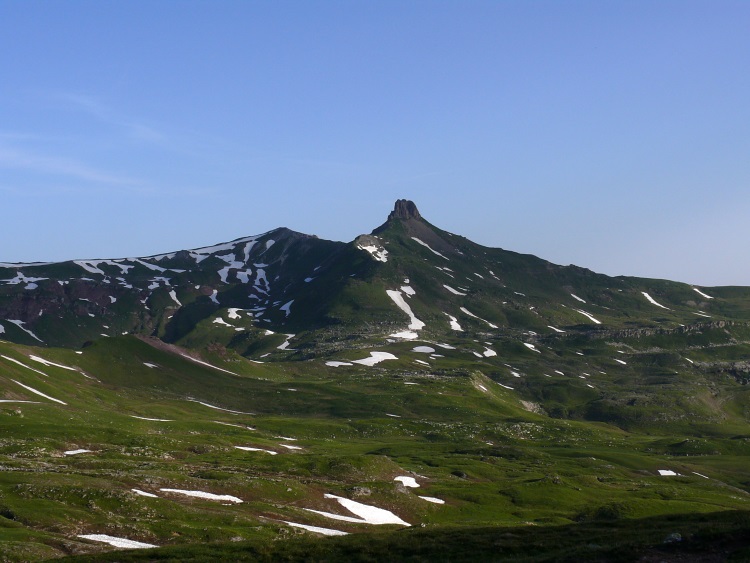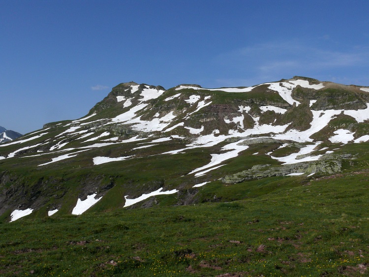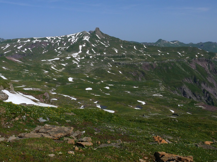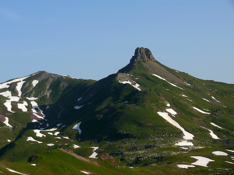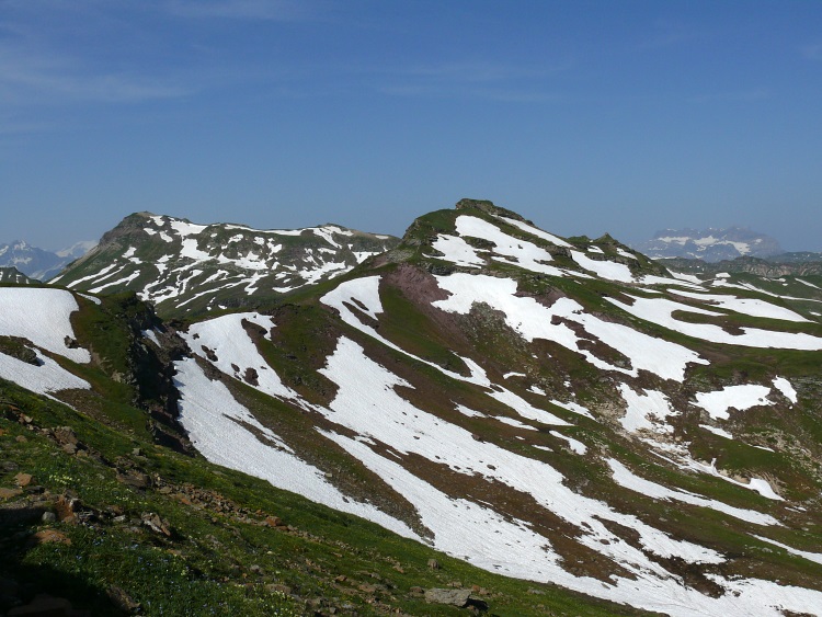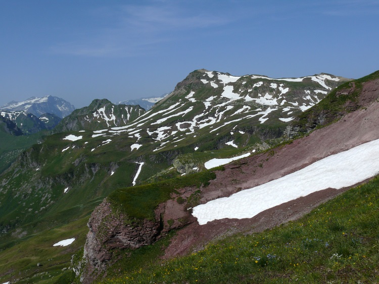 Fahnenstock (ganz rechts, 2612 m, der "niedrige", schneefreie Gipfel), davor der Grauspitz (2478 m)