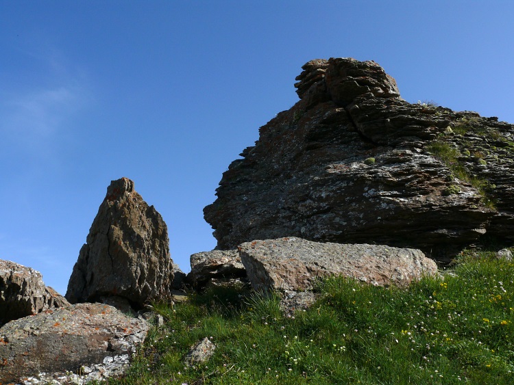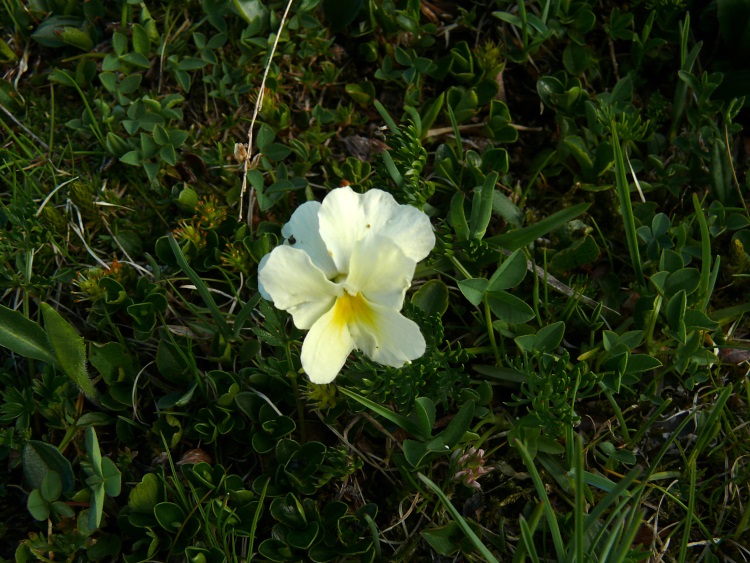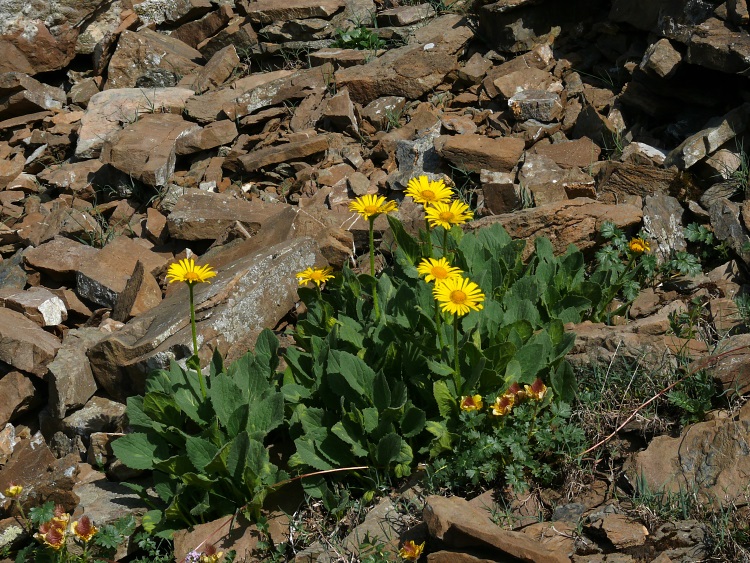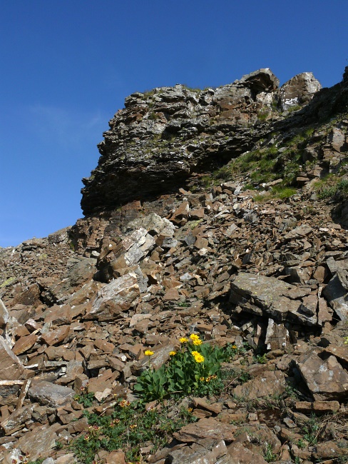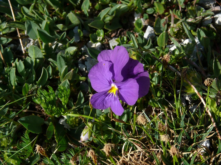 Im Mergelkalk, der hier als dünne Schicht auf dem Verrucano aufliegt, gedeiht das Langsporniges Stiefmütterchen (Viola calcarata)