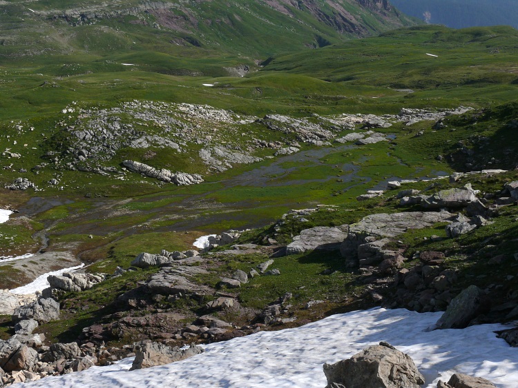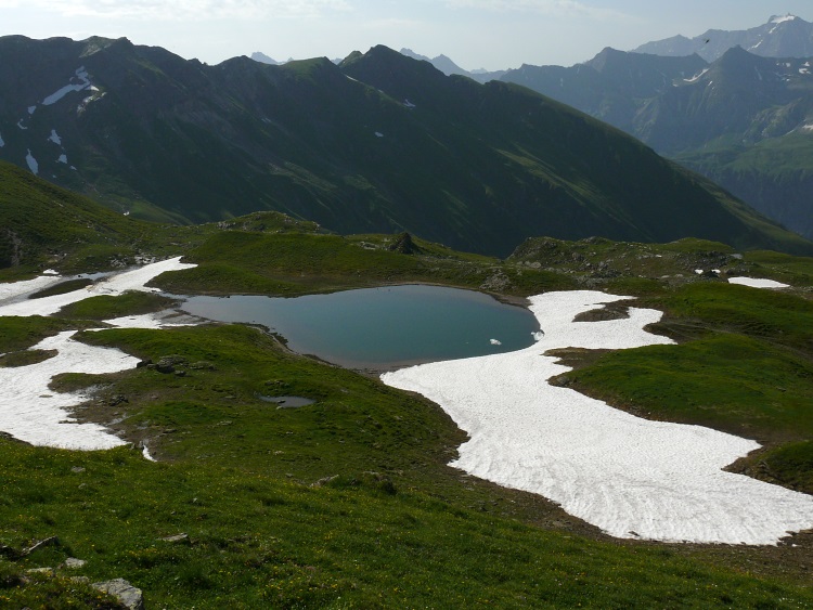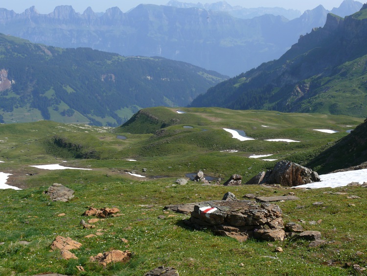 Noch bin ich aber weit oberhalb des Hüttli. Mein eigentlicher Plan war es, über den Guli nach Vorder-Mad und von dort nach Weisstannen abzusteigen. Zunächst ist es aber noch erforderlich, die nördliche Grasflanke des Hüendri zu queren und als Zwischenstation zum Lauifurggla abzusteigen. Das ist auch recht unproblematisch. Die Flanke des Guli ist noch teilweise schneebedeckt und ich tue mich schwer, einen vernünftigen Weg zu finden. Außerdem ist mir nicht klar, an welcher Stelle der Guli am besten zu erklimmen ist. Da es inzwischen selbst auf 2200 m unangenehm warm zu werden beginnt, schwenke ich auf Plan B um und versuche, über das Prudellhüttli ins Weisstannental abzusteigen.