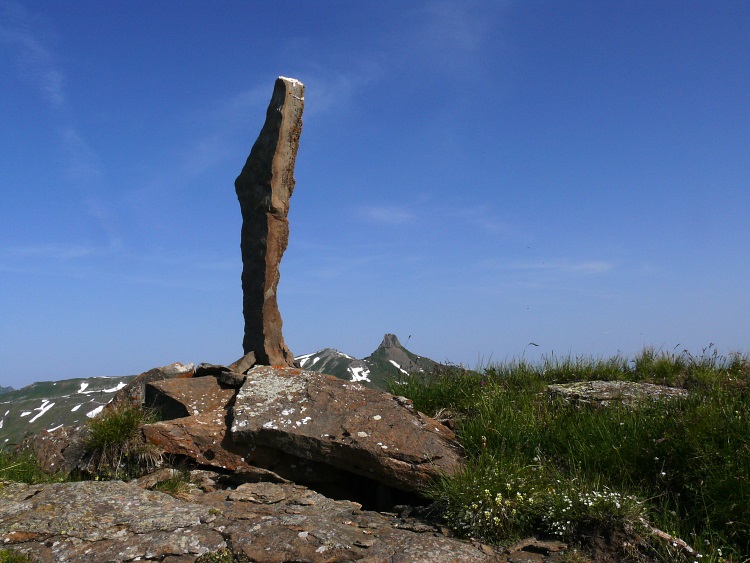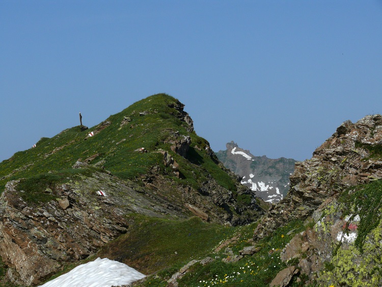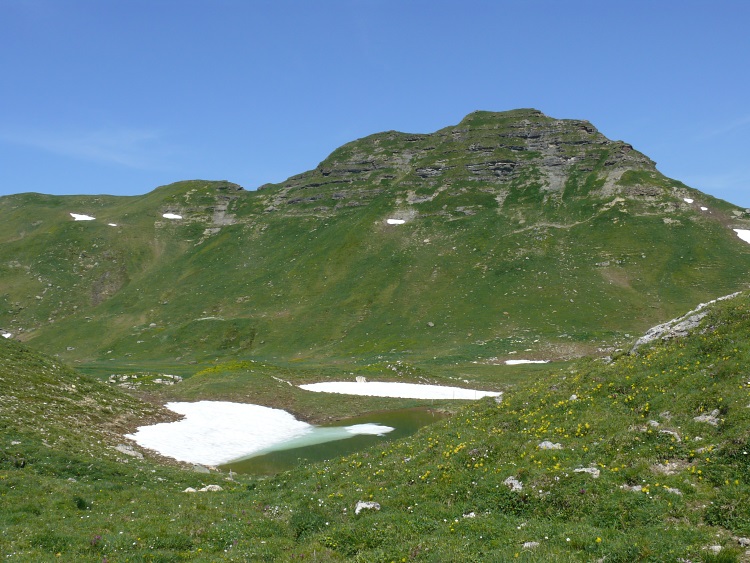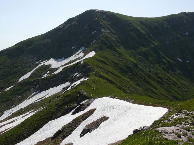 Auf gut markiertem, aber rutschig-nassem Weg geht es nun - die Höhe haltend - unterm Schnürligrat entlang. Bald verfehle ich im Restschnee die Markierungen wieder und laufe aufs Geratewohl leicht ansteigend in einem großen Bogen um den Berg herum. Endlich stoße ich wieder auf eine Markierung; vor mir erscheint der klobige und nicht ganz leicht zu ersteigende Hüendri.