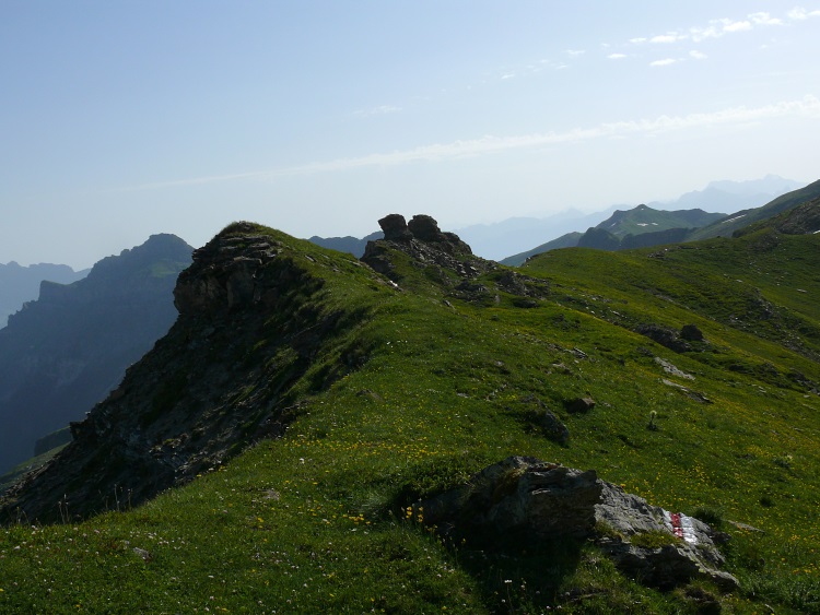 Blick hinüber zu den Rinderhörnern, eher unbedeutende Erhebungen. Für mich sind sie aber interessant, da sie zwar in der falschen Richtung liegen, mir aber nach kurzem Marsch einen Tiefblick hinunter ins Glarnerland, Richtung Matt, zu erlauben versprechen.