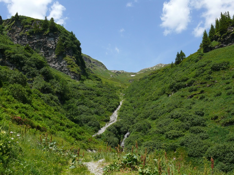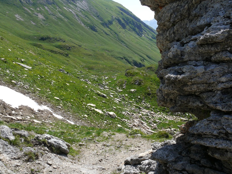 Eher sanft fällt das Tal im Allgemeinen Richtung Weißtannental ab. Nach ein paar Minuten bereits ist ein aus Kalkstein bestehendes Felsband zu überwinden. Dieses zerklüftetes Felsgebilde bietet wiederum ähnlich wie am Fansfurggla Lebensraum für eine erstaunlich vielfältige Flora.