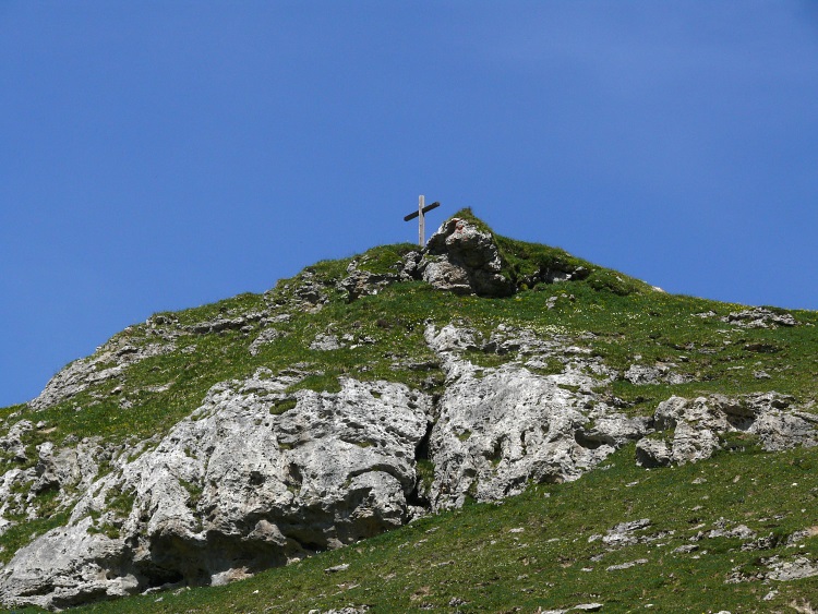 Über dem Hüttchen sieht man bereits eine Art Gipfelkreuz. Zumindest kann man das merkwürdige Gebilde als Ziel ansteuern.