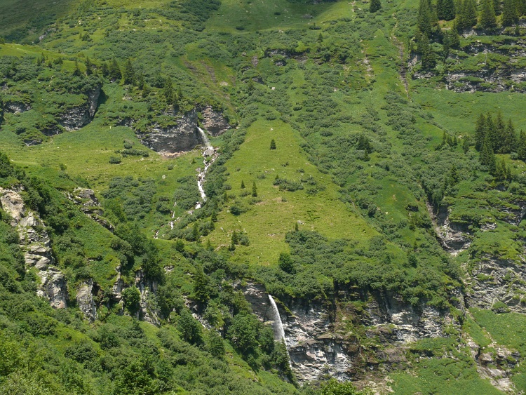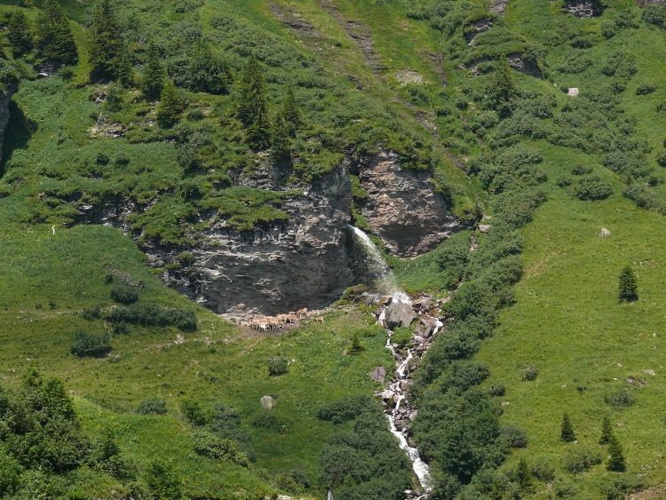 Nun geht es auf breitem Weg durch die Latschenkiefernfelder. Der Weg ist zwar breit, aber durch den Kuhauftrieb bei nassem Wetter zertrampelt und teilweise doch etwas unangenehm zu begehen. Ein Highlight dabei ist der Blick auf diesen Wasserfall, der aus einer Rinne hervorschießt. Eine Herde Kühe genießt wohl die angenehme Kühle, die der Wasserfall produziert.