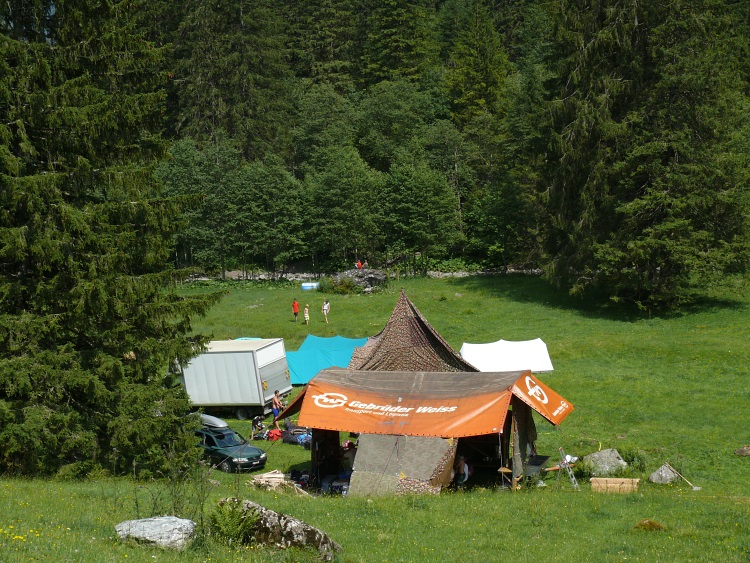 Nun muss ich nur noch auf der Straße nach Vorsiez zurückkehren - trotz des nur mäßigen Anstiegs eine schweißtreibende Arbeit in der Frühnachmittagshitze. Andere kühlen sich ab in den "Fluten" des Seezbaches oder feiern fröhlich im Zeltlager.