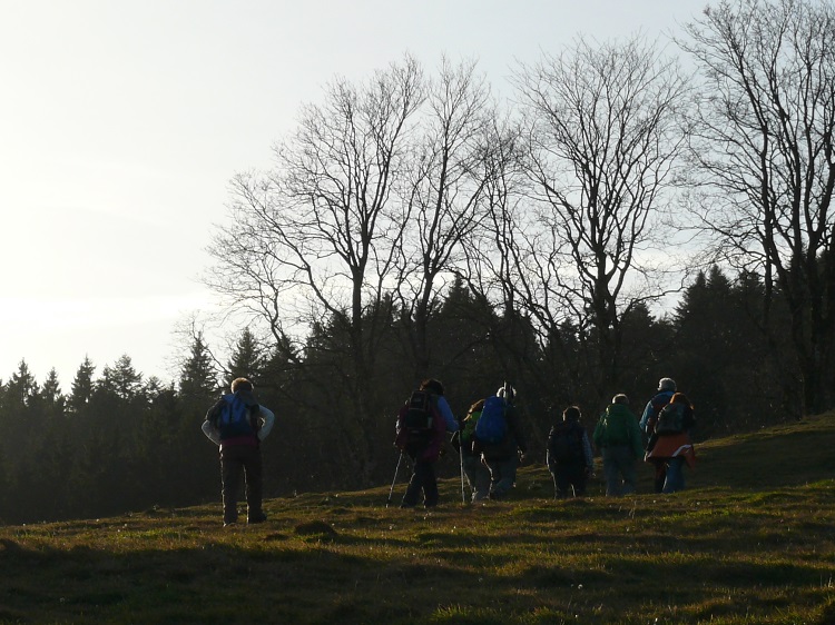 Auch unser Wandertrupp leuchtet, von der Seite betrachtet, noch im Morgenlicht ...