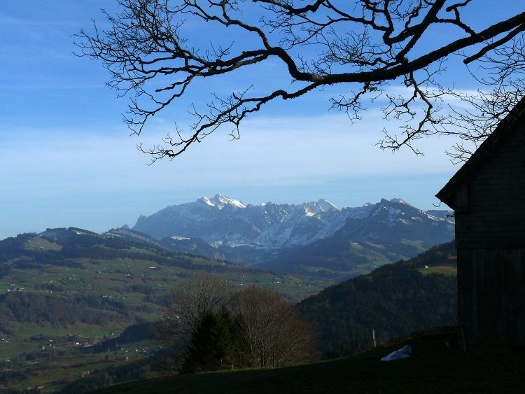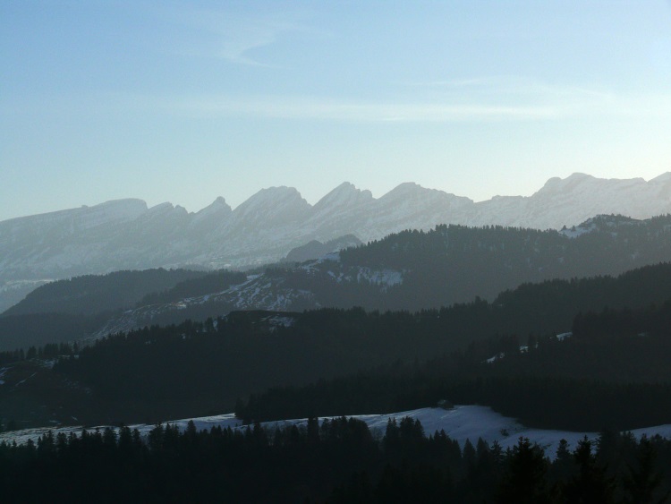 Wie schon viele Jahre zuvor künden sich auch in diesem Jahr nach einem Kälteeinbruch im Oktober und nach leichten Schneefällen im November wieder grüne und recht milde Weihnachten an. Zum vierten Advent sollen insbesondere in den Bergen auf 1000 Meter Höhe über 10°C und damit eher frühlingshafte Temperaturen erreicht werden. So verabschieden wir uns vom Nebel in Konstanz und fahren durch mehrere nebelgefüllte Täler nach Wattwil, um dann beim "Vorort" Ulisbach bereits in aller Herrgottsfrühe, aber bei bereits recht angenehmen Temperaturen und freundlichem Fotografierlicht loszulaufen. Zunächst geht es los auf Hartbelag, den wir aber bereits bei Vorder Schönenberg verlassen und nun über Wiesen recht zügig Richtung Regelstein hochsteigen.