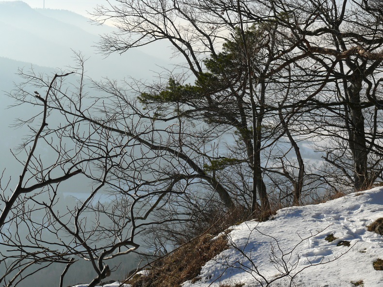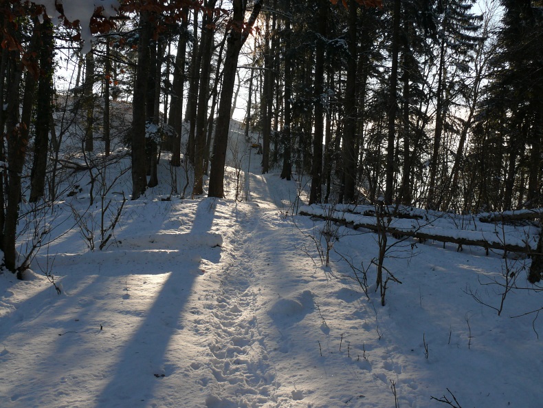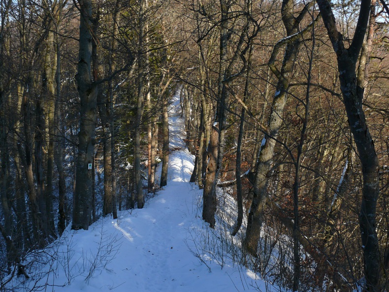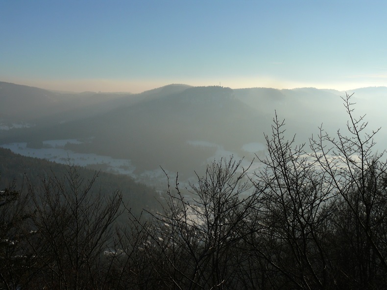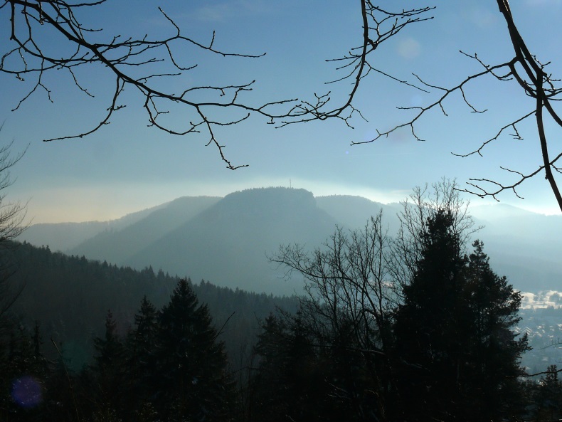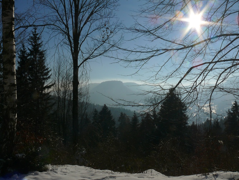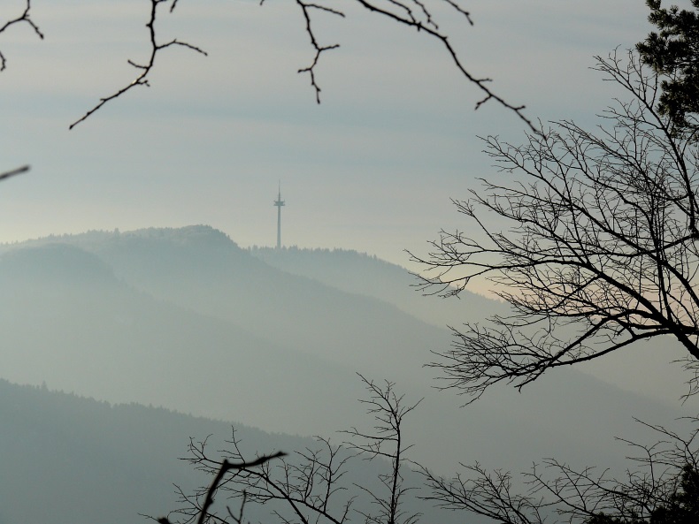 Die Sonne hat im Tagesverlauf von den Bäumen bereits den ganzen Rauhreif weggeschmolzen - mit Ausnahme der Bäume auf der exponierten Gipfelregion, was der Szene eine pittoreske Note verleiht.