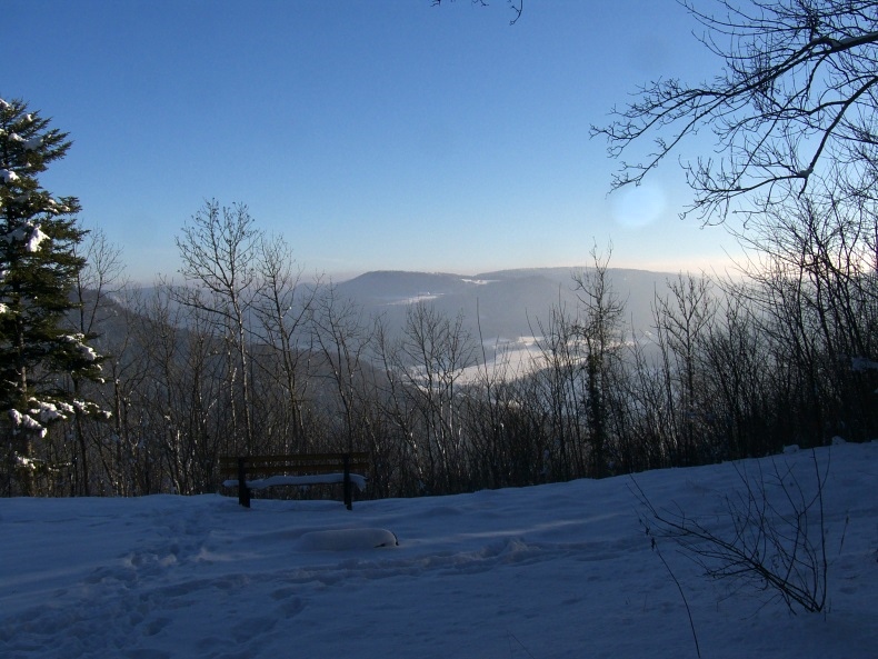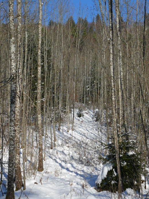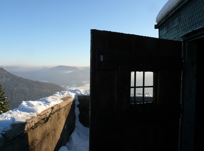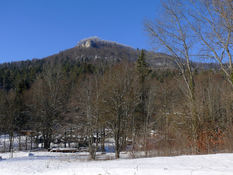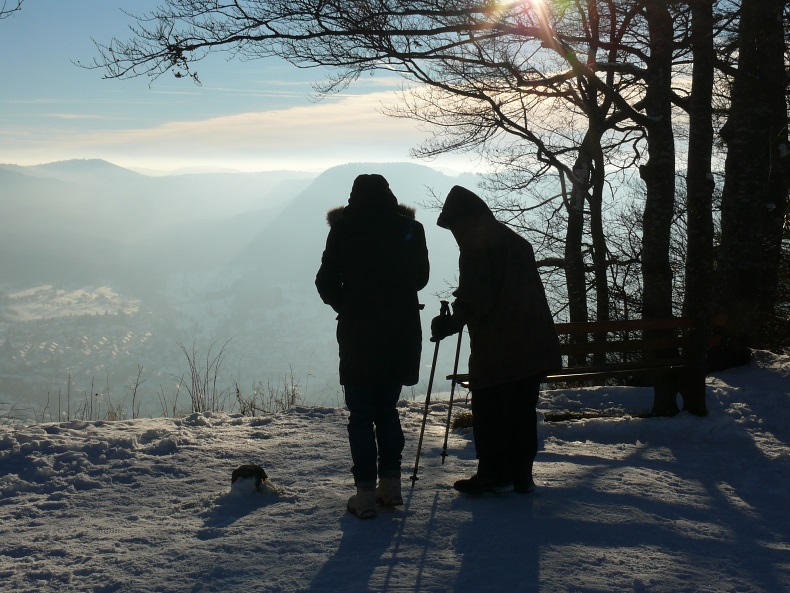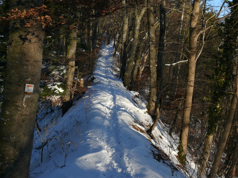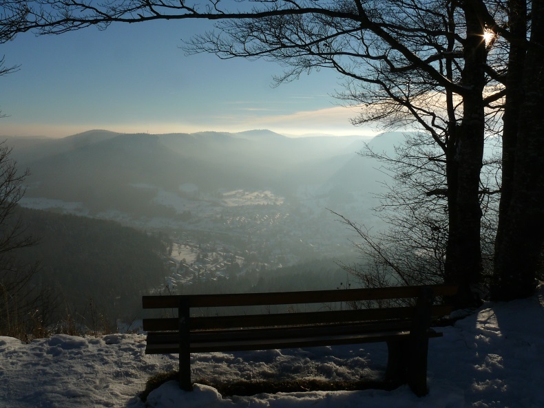 Die Sonne hat im Tagesverlauf von den Bäumen bereits den ganzen Rauhreif weggeschmolzen - mit Ausnahme der Bäume auf der exponierten Gipfelregion, was der Szene eine pittoreske Note verleiht.
