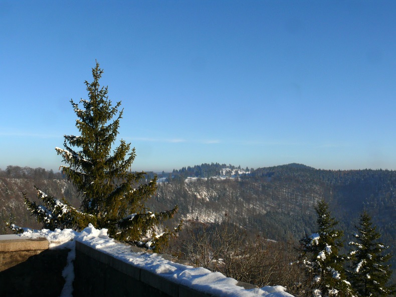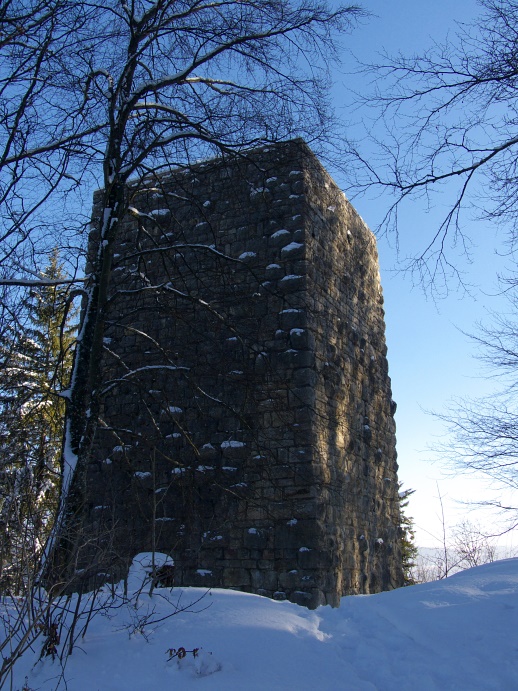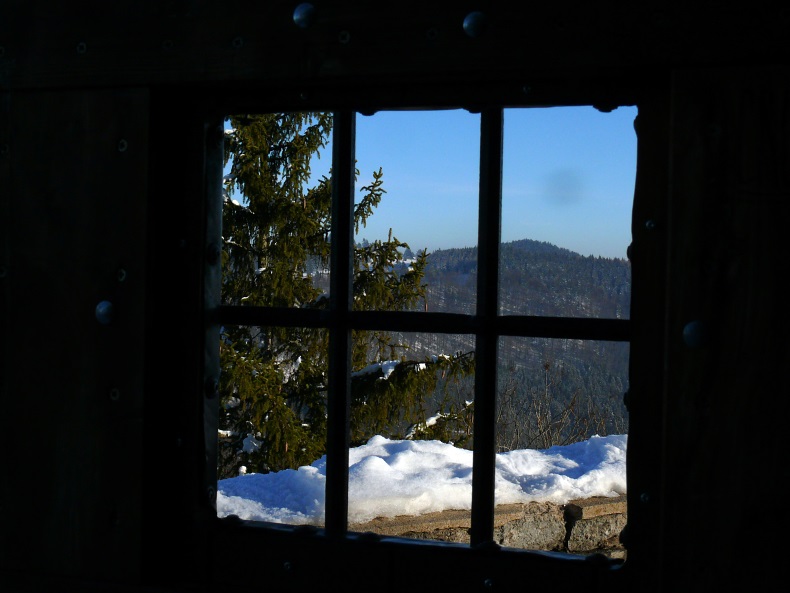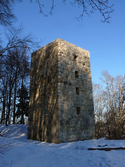 Nun geht es auf schon bekanntem Weg abwärts zurück zur Ruine Schalksburg. Trotz des abschüssigen Geländes ist der Pfad auch im teilweise vereisten Gelände problemlos begehbar. An der Ruine angelangt umrunde ich den Turm einmal und stoße auf eine geöffnete Tür, durch die der Wind hindurch pfeit, aber auch auf Fußspuren, die auf den Turm hochführen. Und so steige auch ich hoch auf die lohnende Aussichtsplattform in etwa 15 m Höhe.