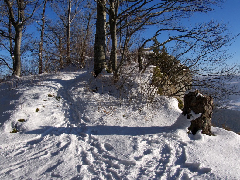 Der Fahrweg biegt nun nach Osten um. Ich nehme den schon etwas ausgetretenen Wanderpfad direkt hoch zur Schalksburg. Nach einer Kehre wird ein Sattel erreicht, bei dem ein etwas rutschiger, teilweise mit Treppen versehener Pfad zum "Gipfel-"Plateau hoch führt.