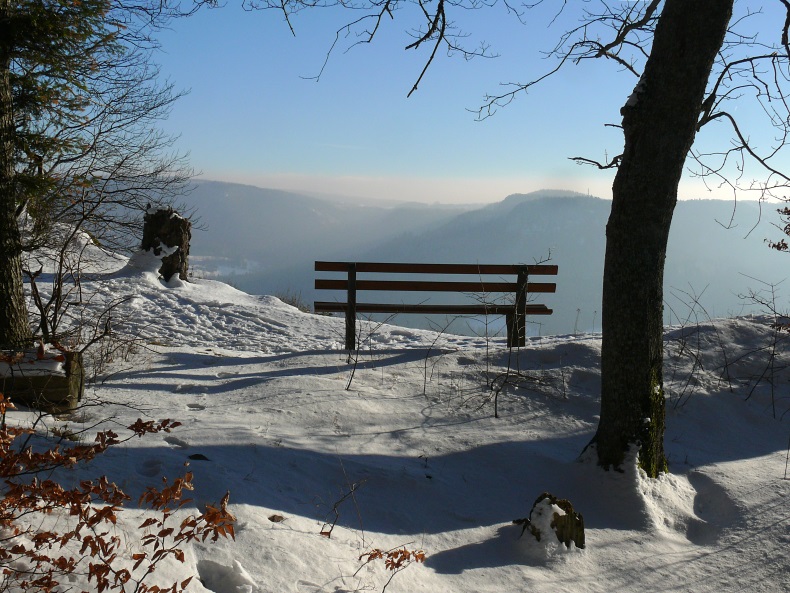 Auch auf dem eigentlichen Gipfel ist ein Ruhebänkchen, allerdings ein etwas eigenwillig konstruiertes, aber mit grandioser Aussicht, installiert. Durch das Waldgebiet wird mein Abstiegsweg zurück zum Parkplatz verlaufen. In dem Hang versteckt sich auch irgendwo das attraktive Felsen-Sammelsurium namens "Felsenmeer".