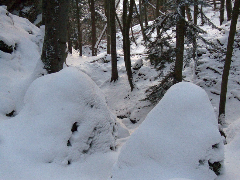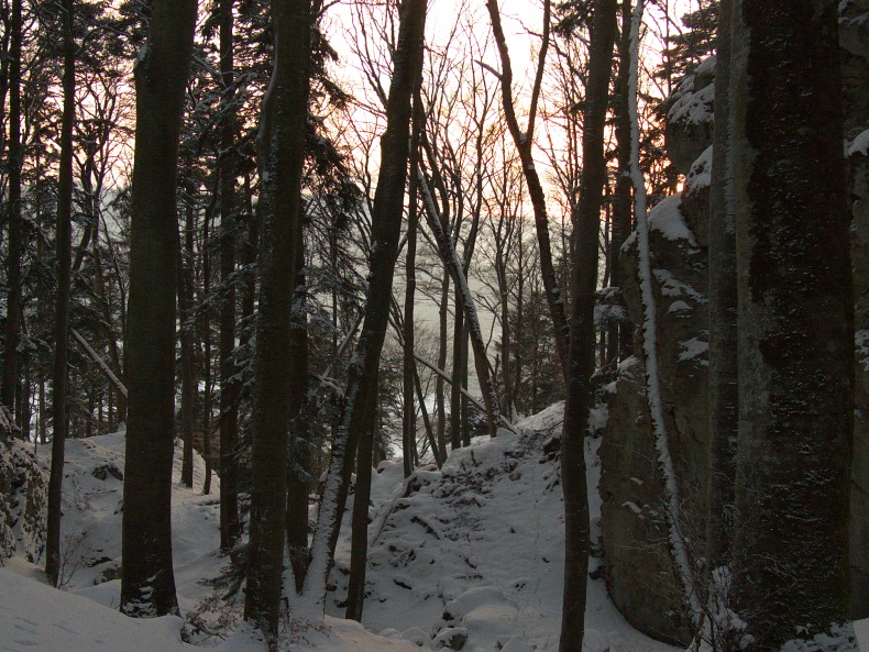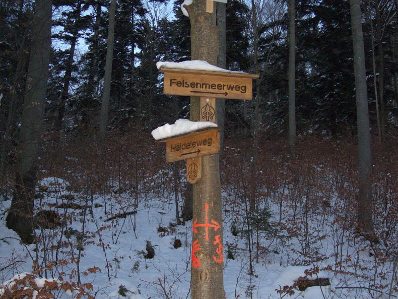 Inzwischen ist es schon sehr spät geworden und ich muss mir überlegen, wie ich vor Einbruch der Dunkelheit mein Auto wieder erreiche. So laufe ich ein Stück zurück und biege in eine Forststraße ab, in der Hoffnung, der Weg führe nach unten. Das erweist sich allerdings als ein Irrtum, denn er führt nur um den Berg herum, also gerade in entgegengesetzter Richtung von meinem Ziel weg. So bleibt nichts anderes übrig als umzudrehen und eine bessere Abstiegsmöglichkeit zu suchen. Zum Glück finde ich bald darauf einen Wegweiser mit dem richtigen Ziel. Also folge ich dem weg, der mich aber in den tiefen Wald führt, aber auch ein geheimnisvolles Zwischenziel, nämlich das "Felsenmeer" verheißt.