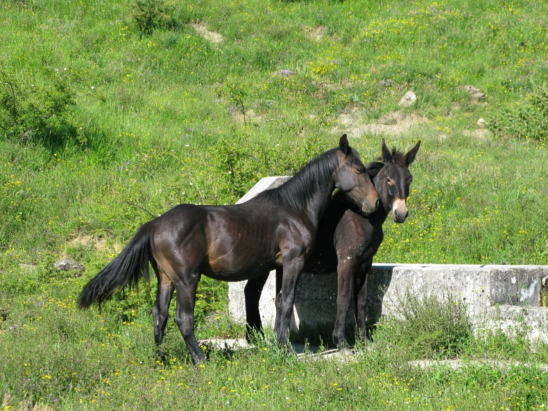 An einer Tränke begegne ich zwei Pferden, die wohl Menschen eher nicht gewöhnt sind. Zumindest verhalten sie sich sehr scheu und halten Abstand.