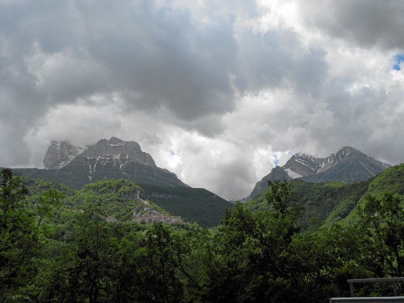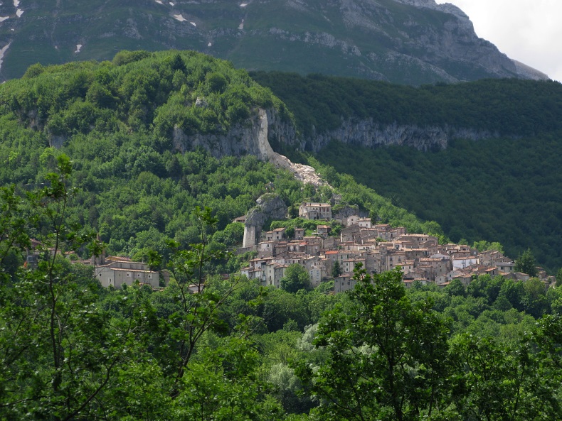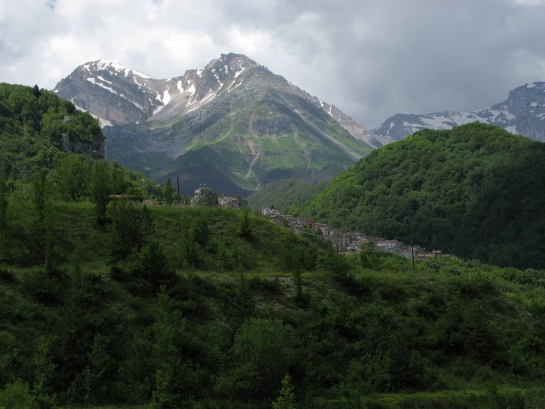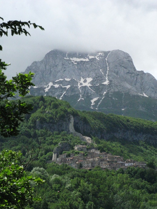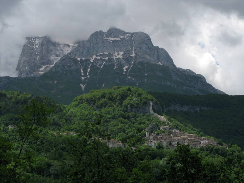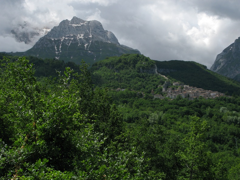 Von Wald umringt liegt am Fuß einer Anhöhe Pietracamela. Dahinter türmen sich die Berggipfel des Gran Sasso-Massives - hier der Corno Piccolo, die höchsten Gipfel des Gran Sasso sind aufgrund der Bewölkung den Blicken noch entzogen