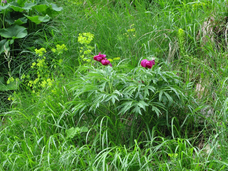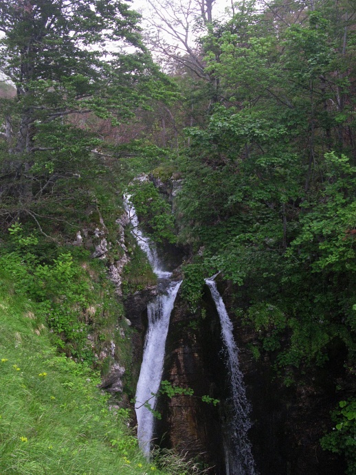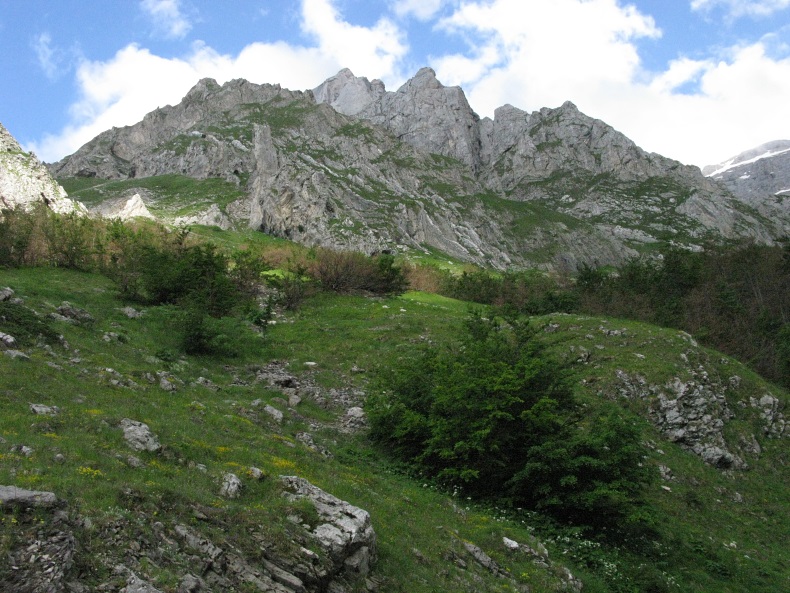 Der Weg steigt nun steil durch ein enges Tal an und kommt bei etwa 1800 m bereits an die Baumgrenze. Auch hier sieht man, dass die frisch ausgetriebenen Birkenblätter während des Maienfrostes erfroren waren.