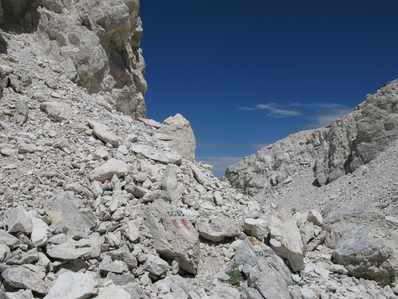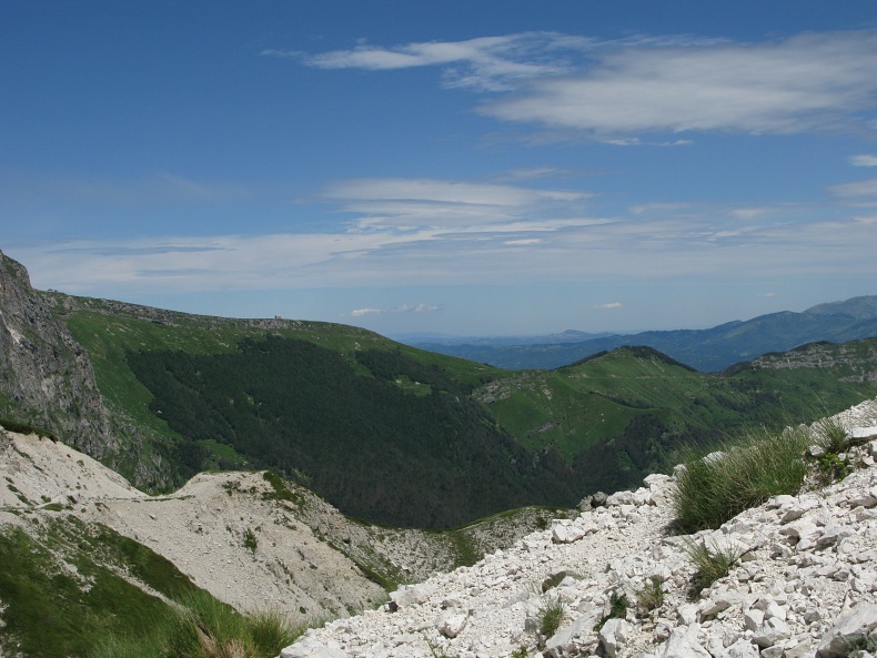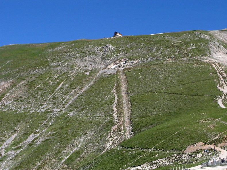 in der Mitte der Bergflanke verläüft der Wanderweg zum Sattel di Monti Aquila führt, darüber das Rifugio.