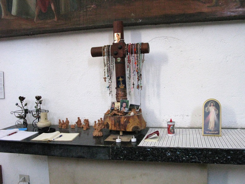 In der Kirche mit Gästebüchern, Devotionalien und Andenken.