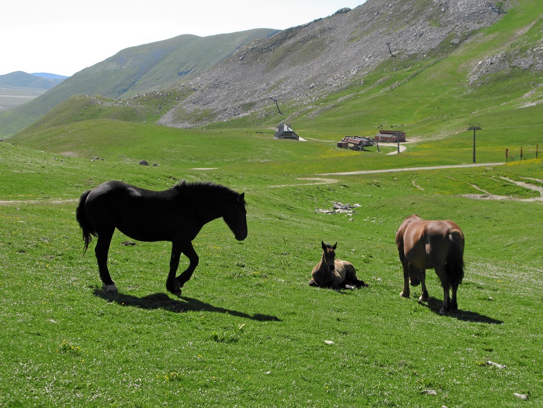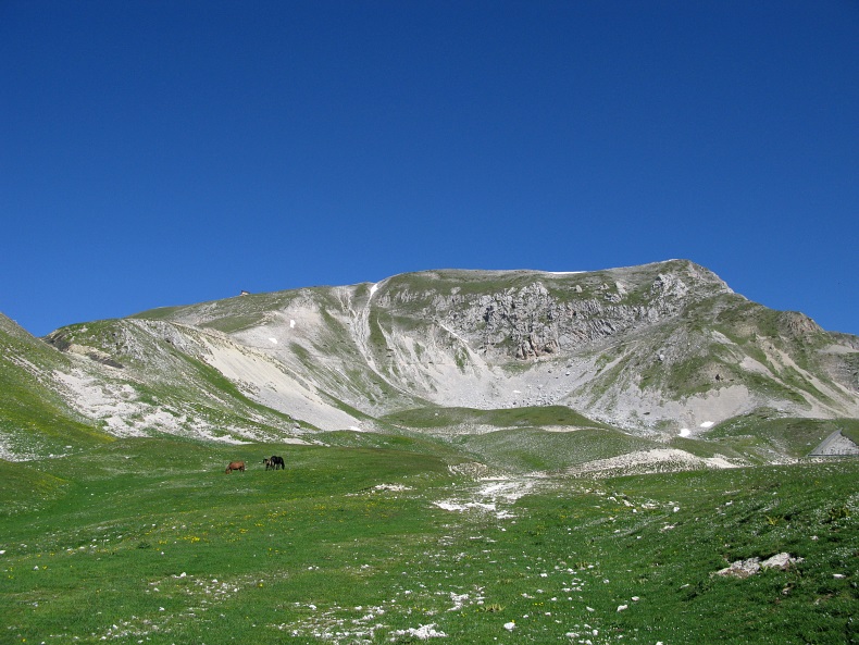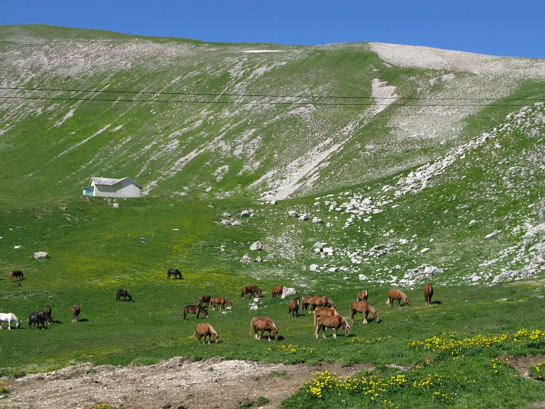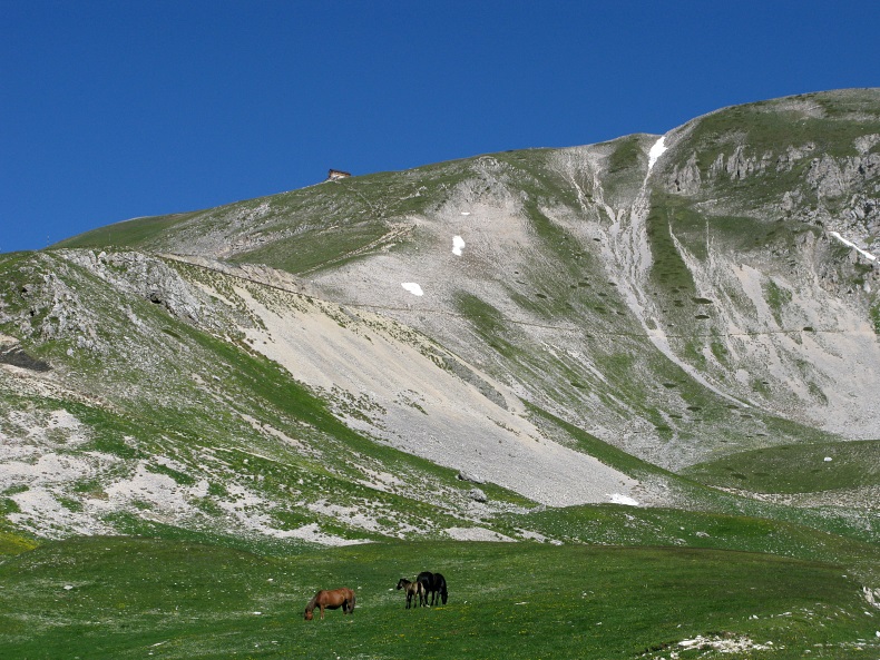 Der Bergkamm mit der Hütte, davor grasende Pferde auf dem Campo Imperatore