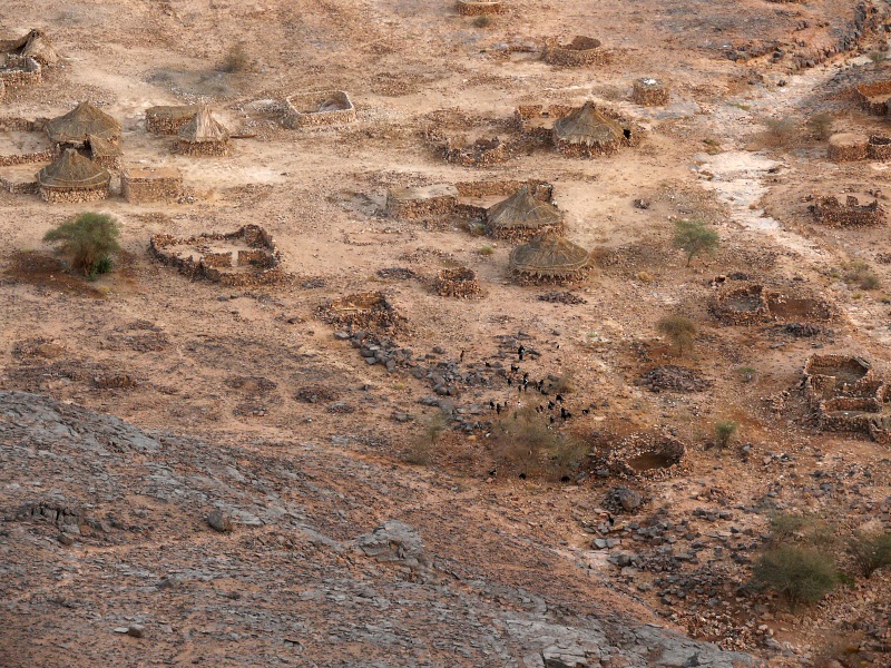 Hütten und eine kaum sichtbare Herde schwarzer Ziegen