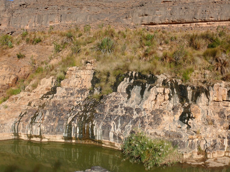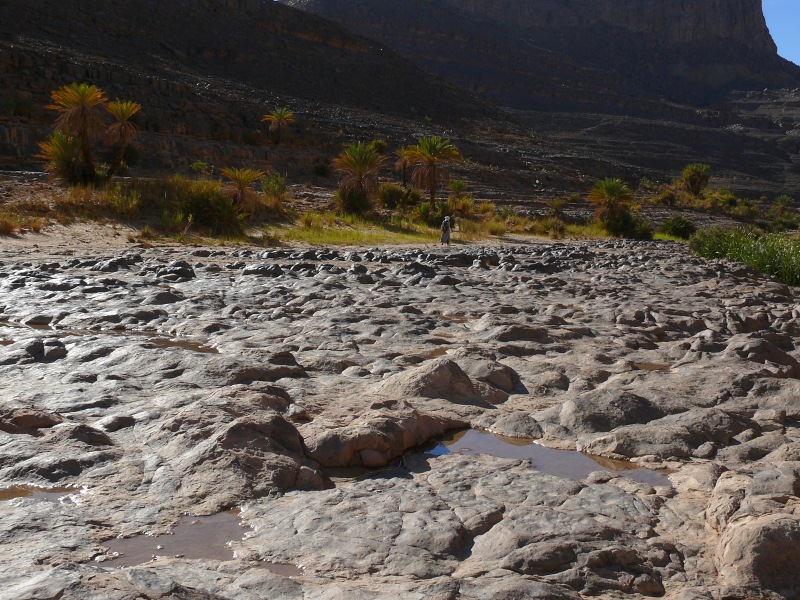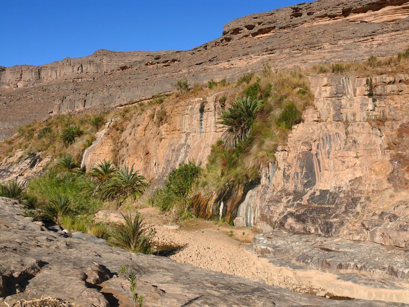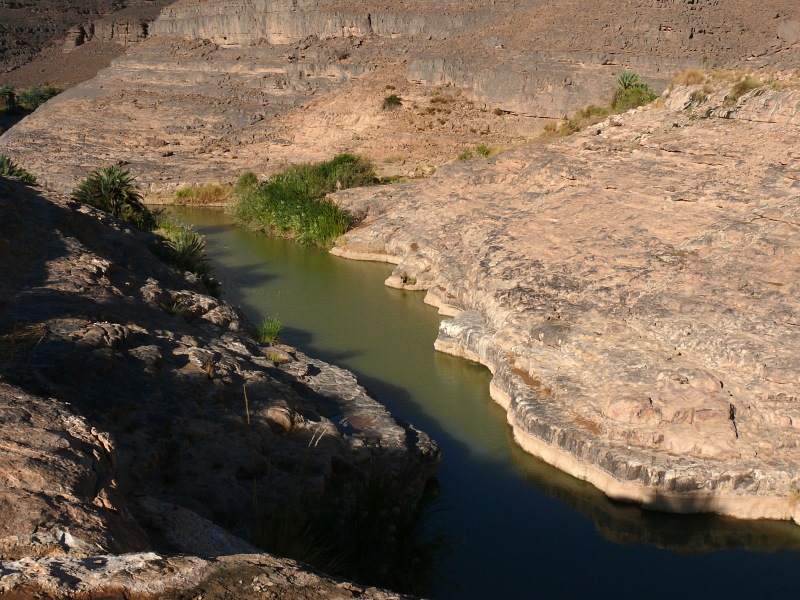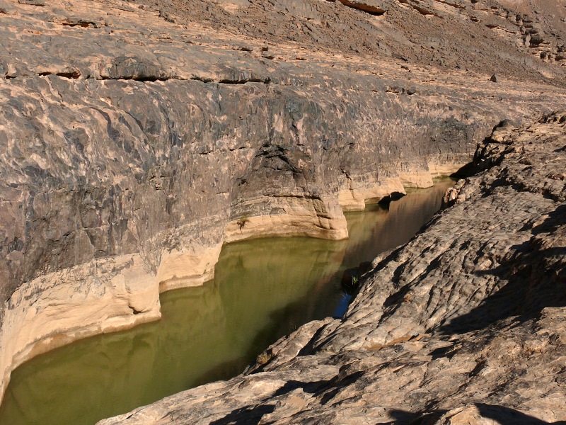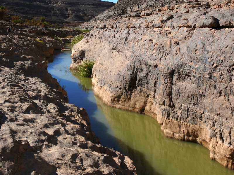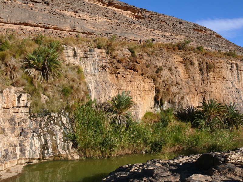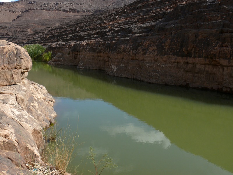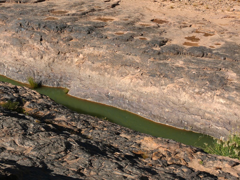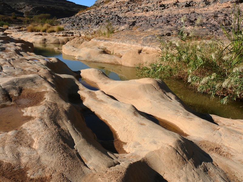 Tief hat sich hier der Fluss durch die Jahrhunderte durch Zeiten hoher Niederschläge eingegraben. Momentan in der niederschlagsarmen Zeit aber sind nur einzelne, kaum miteinander verbundene Wasserbecken übriggeblieben. Die Hochwassermarke ist aber gut an dem hellen Gestein zu sehen, wo der ansonsten dominierende dunkle Wüstenlack vom schnell fließenden Wasser abgetragen ist. An anderen Stellen ist das reißende Hochwasser an den Gegenständen zu erkennen, die sich während der Fluten hoch in den biegsamen Palmen oder dem Gestrüpp verfangen haben