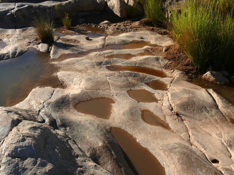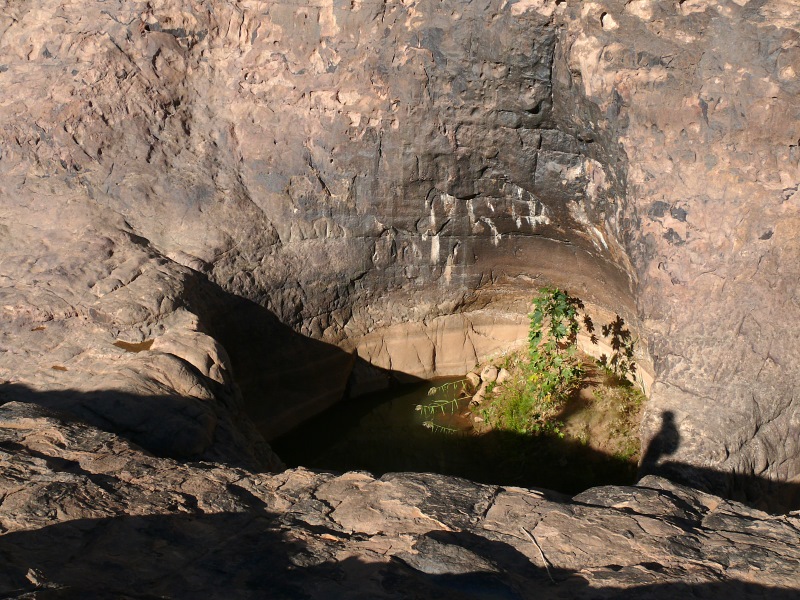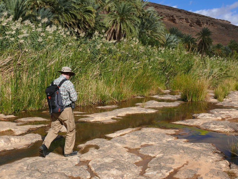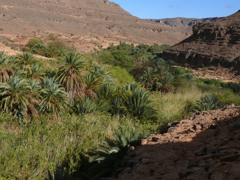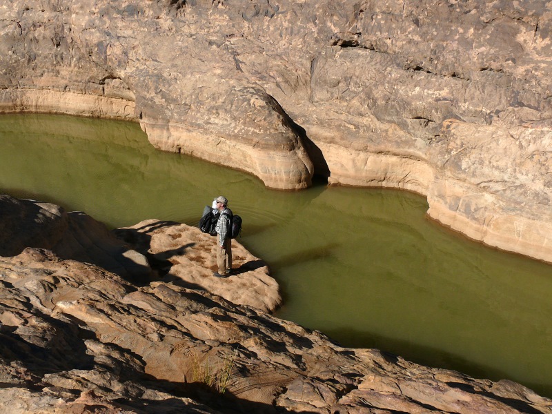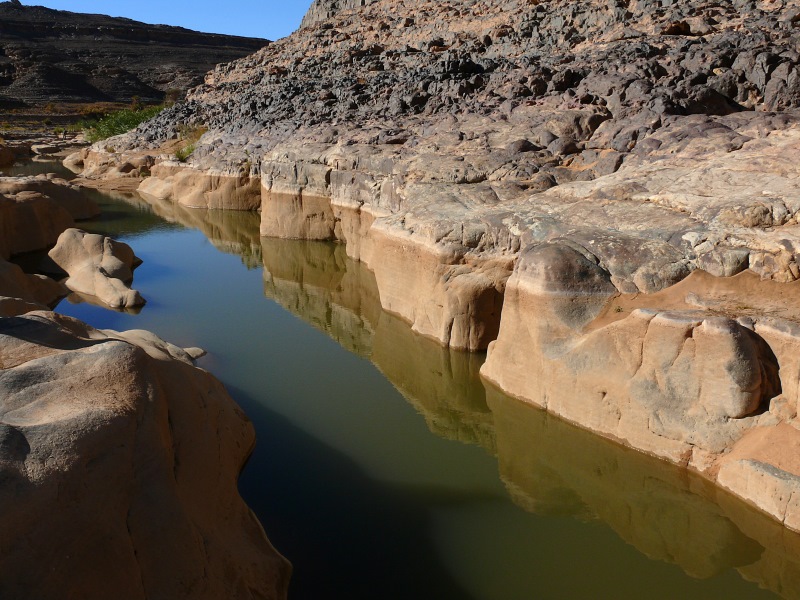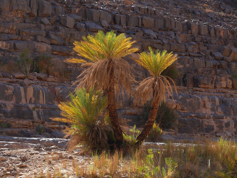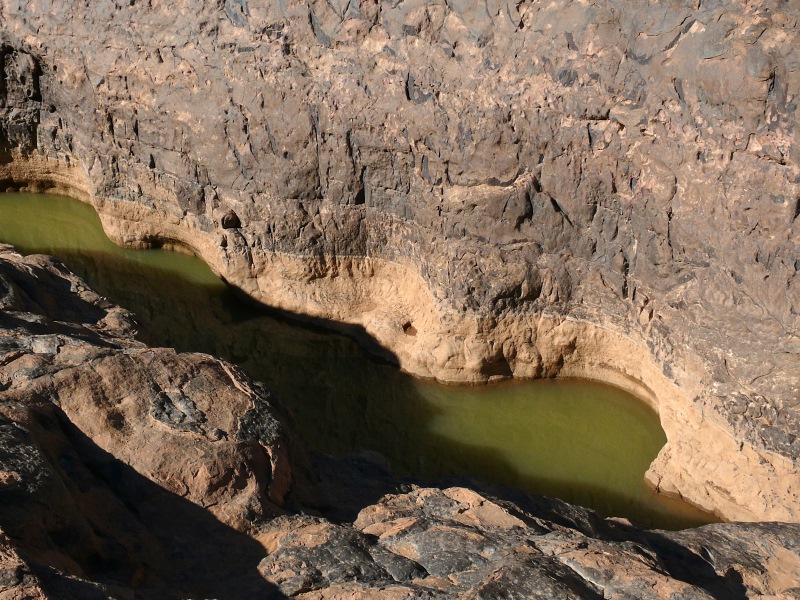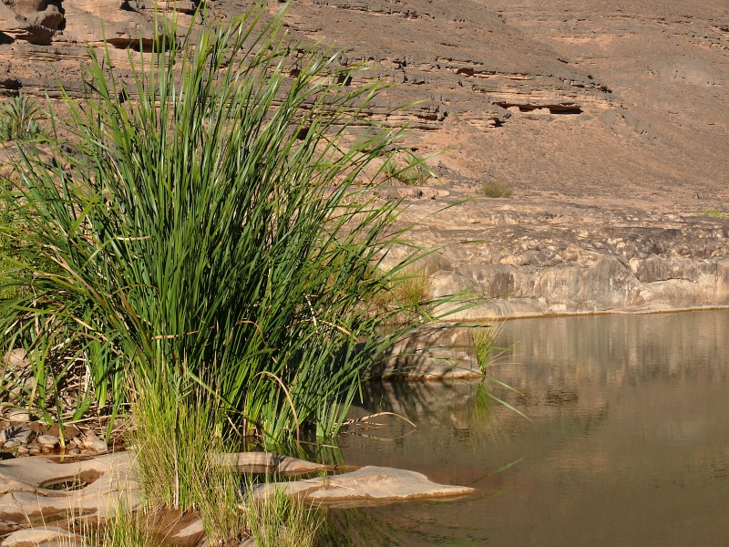 Tief hat sich hier der Fluss durch die Jahrhunderte durch Zeiten hoher Niederschläge eingegraben. Momentan in der niederschlagsarmen Zeit aber sind nur einzelne, kaum miteinander verbundene Wasserbecken übriggeblieben. Die Hochwassermarke ist aber gut an dem hellen Gestein zu sehen, wo der ansonsten dominierende dunkle Wüstenlack vom schnell fließenden Wasser abgetragen ist. An anderen Stellen ist das reißende Hochwasser an den Gegenständen zu erkennen, die sich während der Fluten hoch in den biegsamen Palmen oder dem Gestrüpp verfangen haben