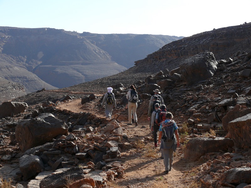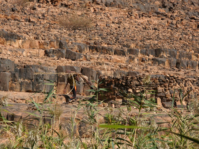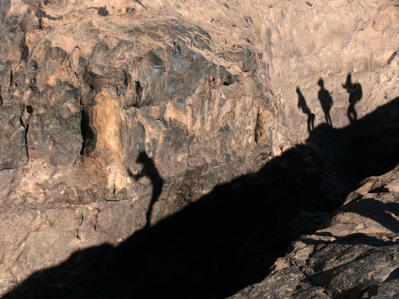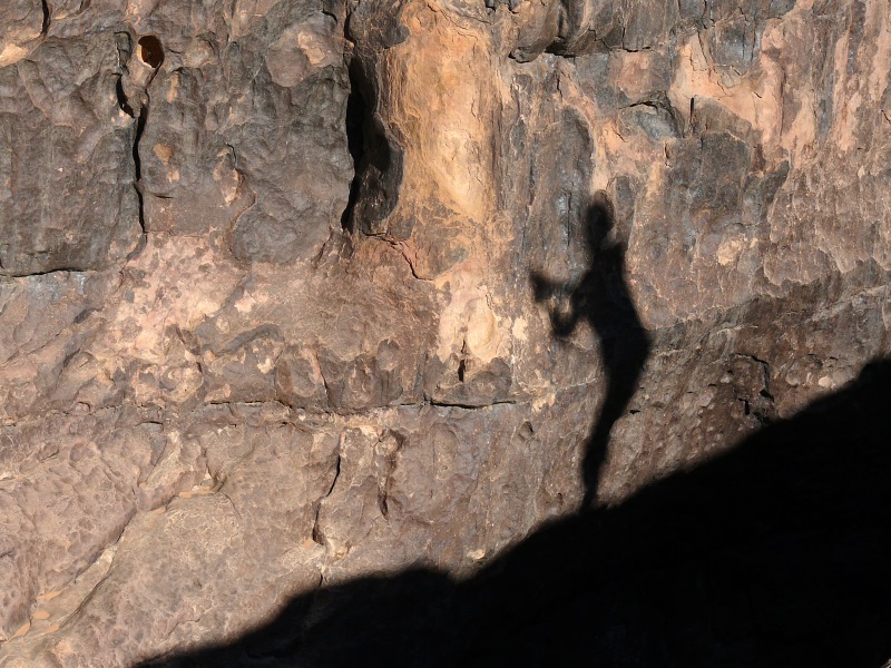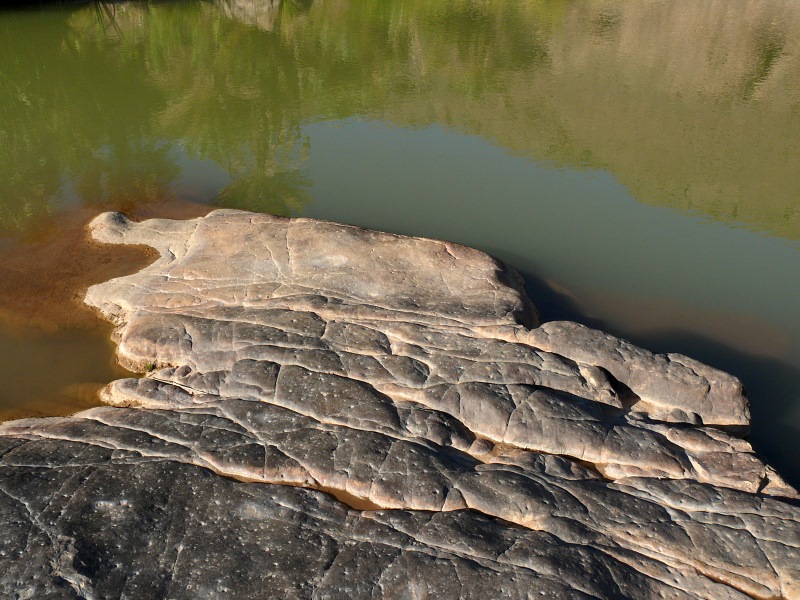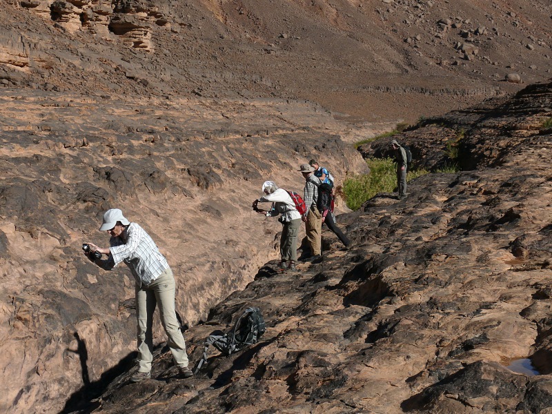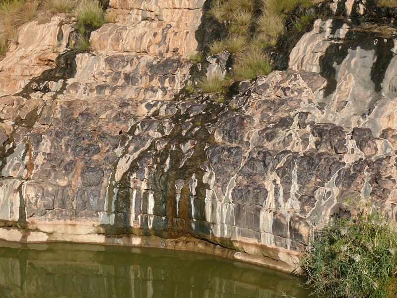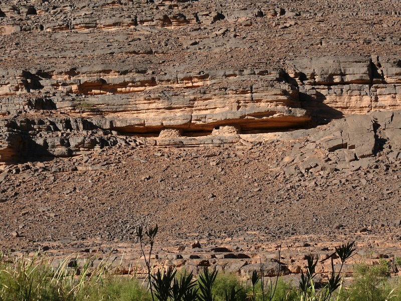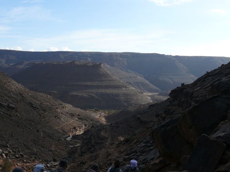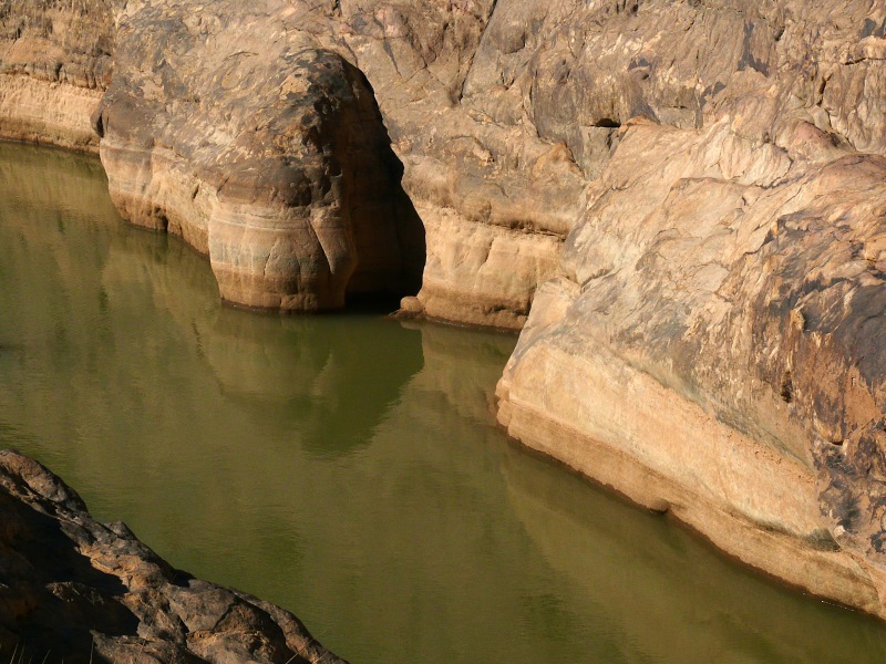 Tief hat sich hier der Fluss durch die Jahrhunderte durch Zeiten hoher Niederschläge eingegraben. Momentan in der niederschlagsarmen Zeit aber sind nur einzelne, kaum miteinander verbundene Wasserbecken übriggeblieben. Die Hochwassermarke ist aber gut an dem hellen Gestein zu sehen, wo der ansonsten dominierende dunkle Wüstenlack vom schnell fließenden Wasser abgetragen ist. An anderen Stellen ist das reißende Hochwasser an den Gegenständen zu erkennen, die sich während der Fluten hoch in den biegsamen Palmen oder dem Gestrüpp verfangen haben