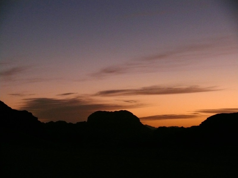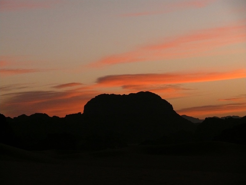 Blick nach Osten bei Sonnenaufgang auf den bereits gestern im Abendlicht bewunderten Felsklotz in der Ferne.
