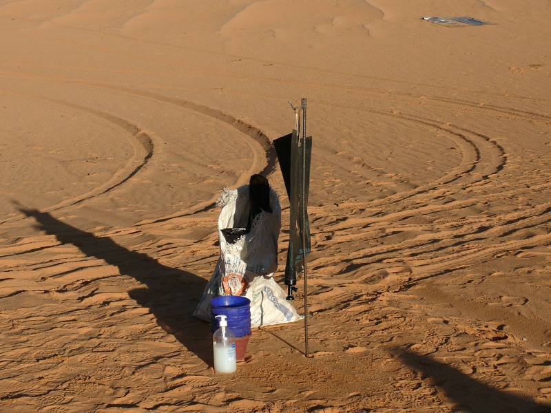 Unser Wüsten-"Bad": ein Handvoll kostbares Wasser ist ausreichend zum Händewaschen; ab und zu kann es für die Körperpflege auch ein bisschen mehr sein, aber mehr als einen 'winzigen Schluck' braucht man dafür in der trockenen Luft der Wüste nicht vergeuden.
