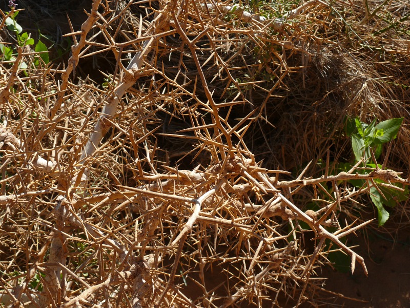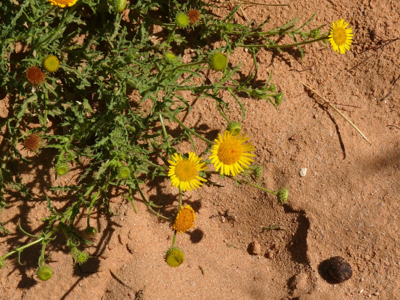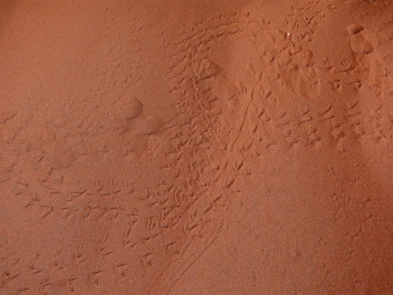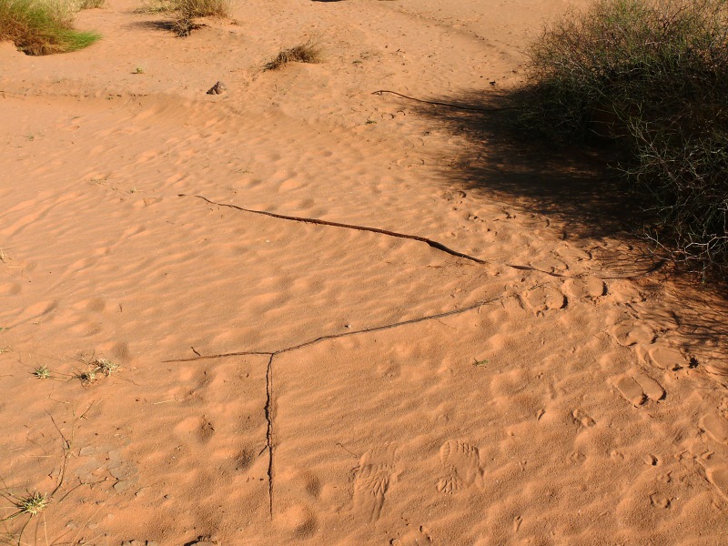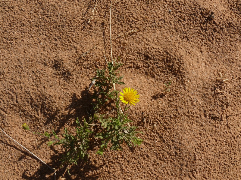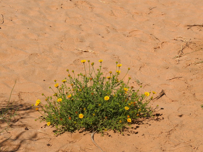 Hier wurden wir zum ersten Mal auf winzigkleine Erhebungen im Sand aufmerksam (gemacht). Darunter verbergen sich die Keimlinge der Samen, die sich die Gunst des feuchten Wetters zunutze gemacht und massenhaft zu sprießen begonnen haben. Noch sind nur die beiden Keimblätter entwickelt und gleichzeitig durch eine Sandhaube vor der Sonne geschützt. Erstaunlich aber, wie die ansonsten doch eher zarten Sämlinge den Wüstenboden mit ihrer stetigen sanften Kraft anheben können.