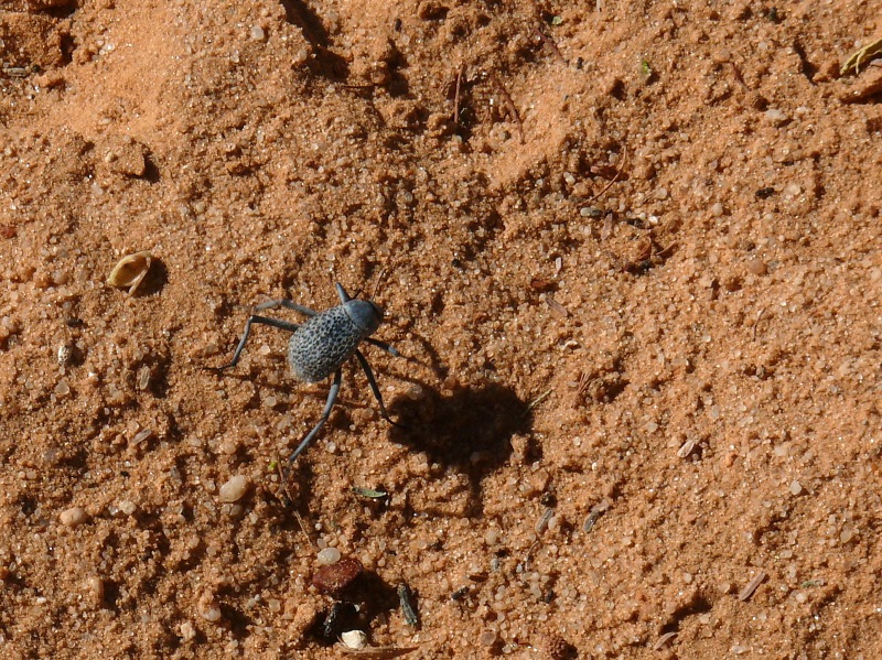 Ein etwas hellerer Vertreter der Schwarzkäfer-Gattung. Auffallend sind die langen Stelzenbeine, mit denen der Käfer einen allzu engen kontakt mit dem heißen Sandboden vermeiden kann. Auch Kamele leben aus ähnlichen Gründen auf "großen (d.h. hohen) Füßen".