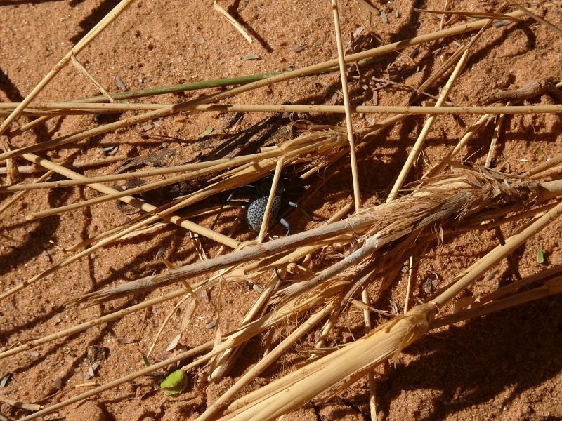 Ein Schwarzkäfer, der sich von Nahrungsresten im Sand ernährt, lebt gefährlich. Hier jedoch finde er unter trockenen Grashalmen einen gewissen Schutz vor seinen Fressfeinden.