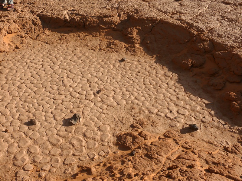 Nach Regenfällen fließt der Niederschlag in kaum wahrnehmbaren Gefälle durch die Canyons Richtung Osten und versickert oder verdunstet in der Wüstenlandschaft. Zurück bleiben große graue, topfebene Tonebenen, gebildet aus den feinsten Schwebstoffen, die das strömende Wasser mit sich geführt hat.