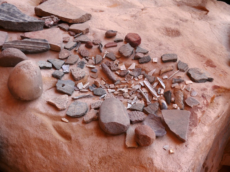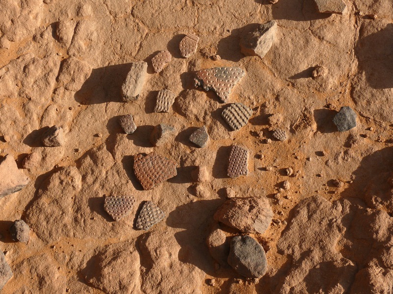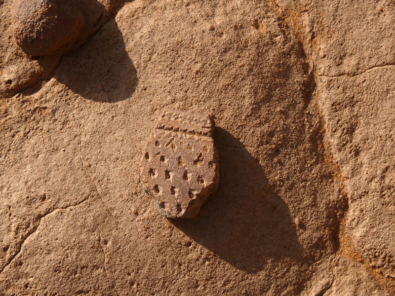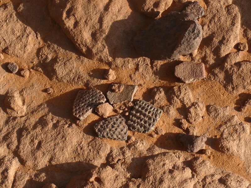 Typisches Muster einer Tonscherbe, wie sie hier reichlich auf dem Boden herumliegen