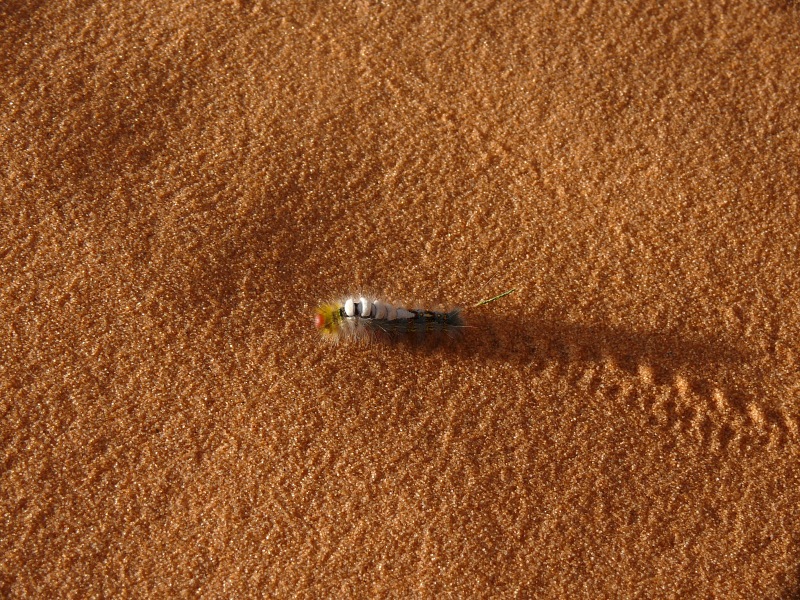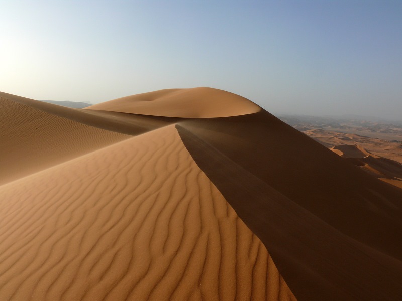 Fast am "Gipfel" angelangt. Während bisher eine erhabene Stille herrschte, beginnt nun zunehmend eine steife Brise zu wehen, der den Sand in Wellen über den Dünenkamm treibt.
