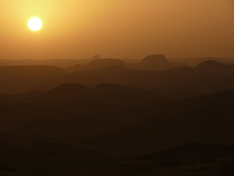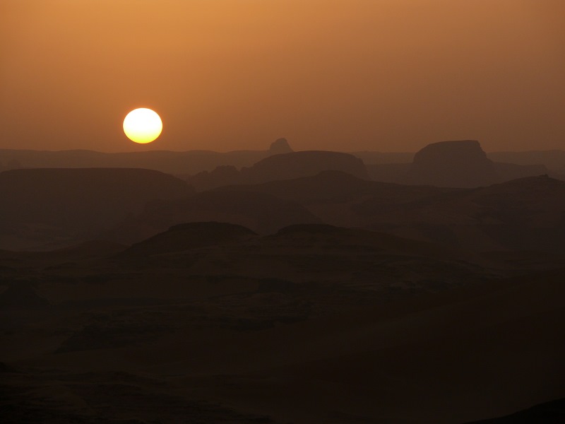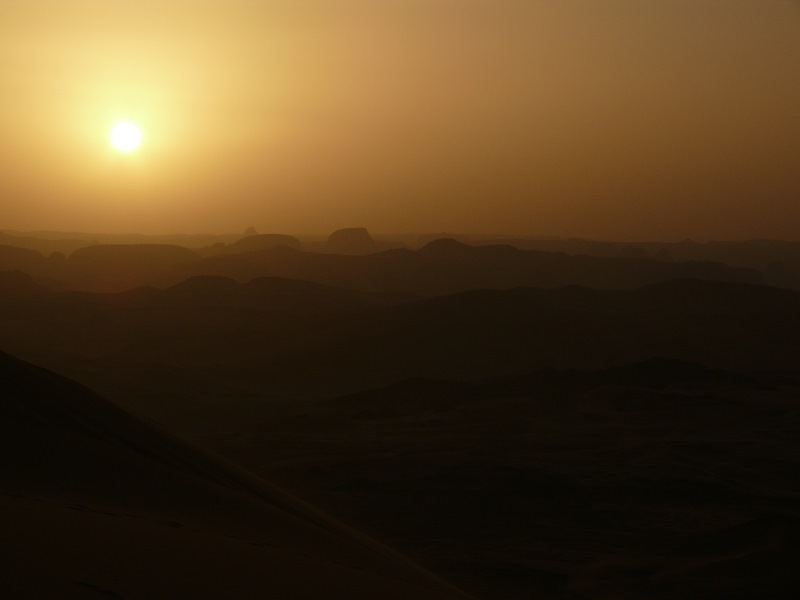 Wir warten noch ab, bis die Sonne hinter den Bergen versinkt. Durch den leichten Sandsturm ist die Sicht etwas beeinträchtigt und die Sonne bald nur noch schemenhaft zu erkennen, was dem Ganzen in dieser goldenen Stunde eine besondere Stimmung verleiht.