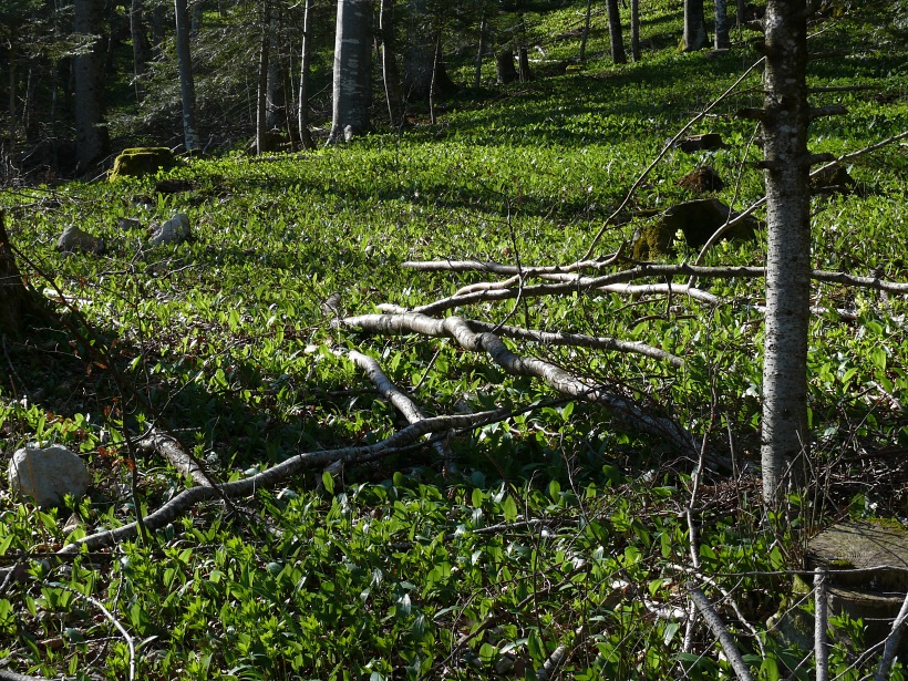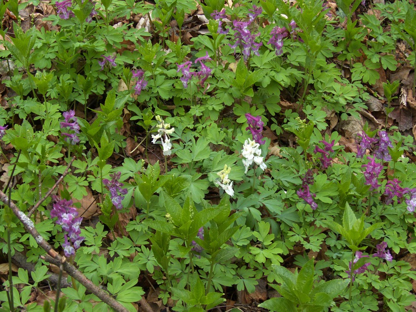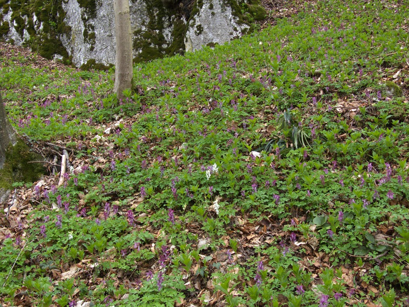Felder mit Lerchensporn, einem typischen Frühblüher in Laubwäldern. Wenn sich das Blätterdach über dem Waldboden geschlossen hat, hat der krautige Lerchensporn bereits genügend Sone und Energie in ihren Knollen getankt, um auf den nächsten Frühling zu warten.
