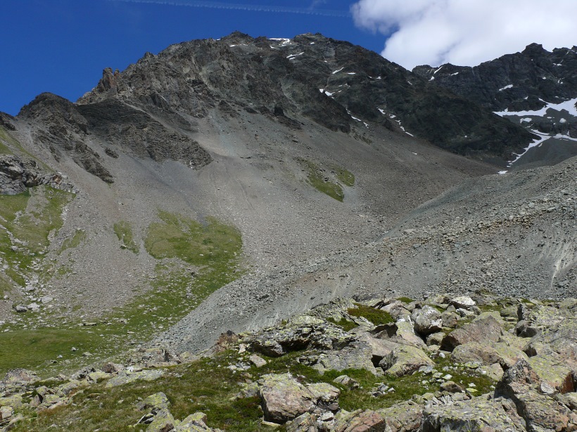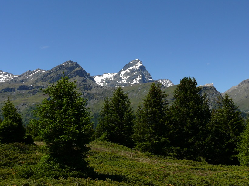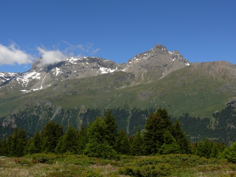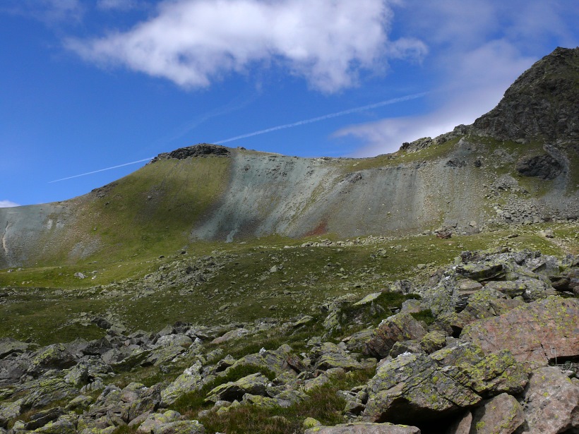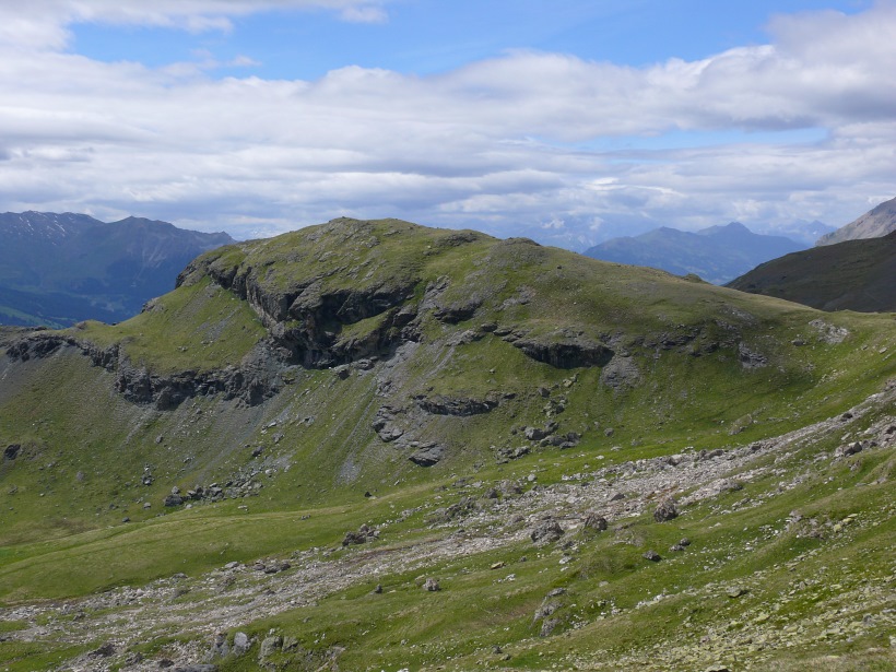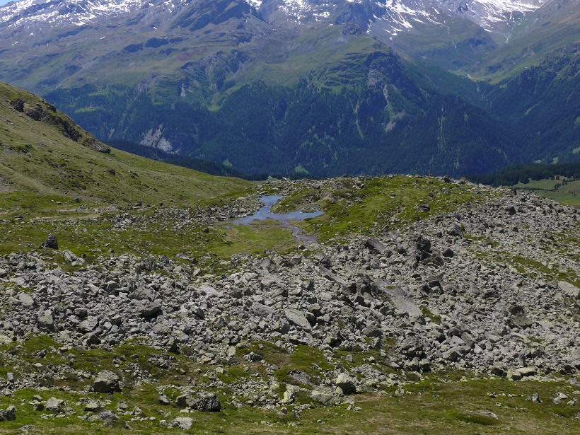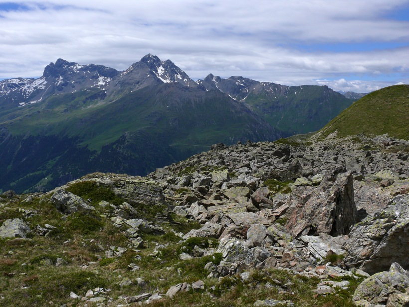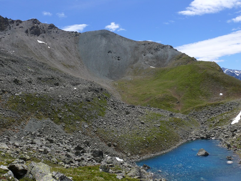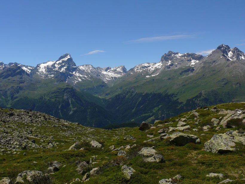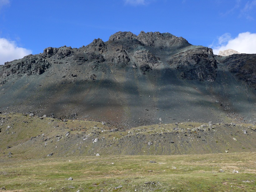 weitere Info | Von Tellers Davains - mit einem (leider unbenannten) schönen See zum Rasten - kann der Piz Calderas auf einer wenig begangenen T5-Route bestiegen werden |
