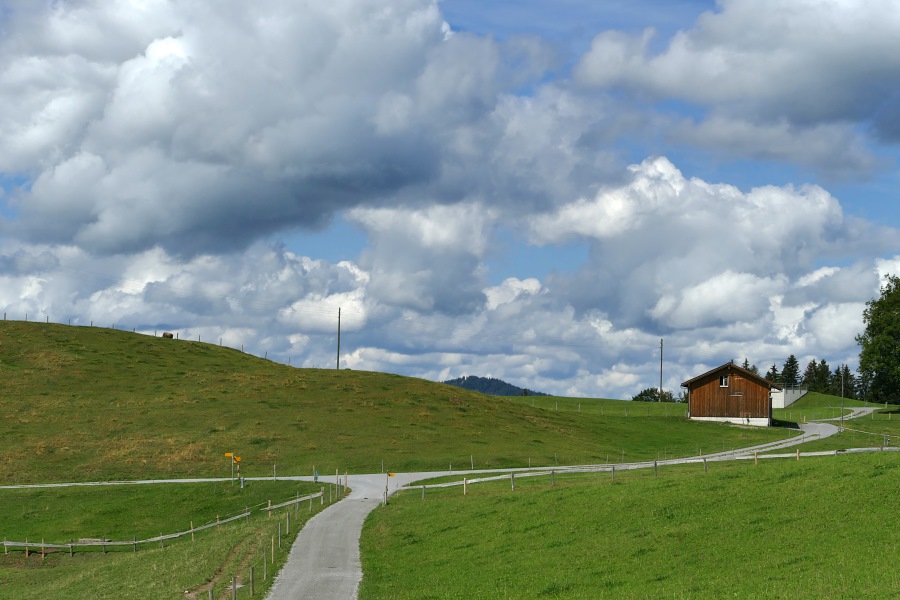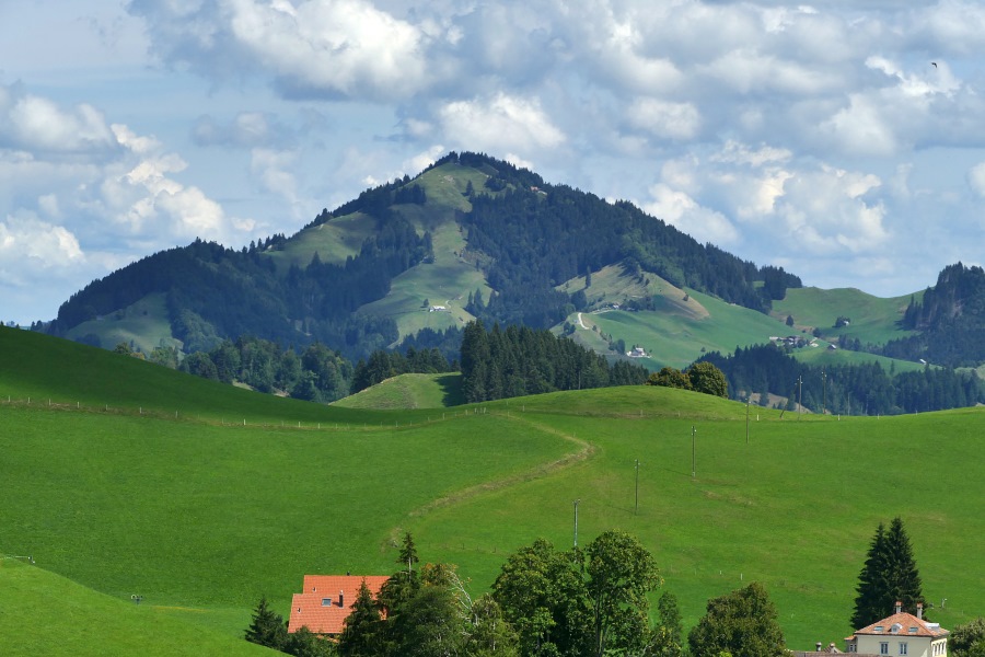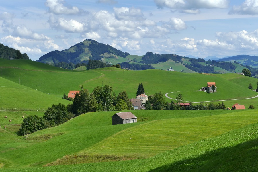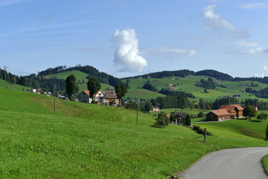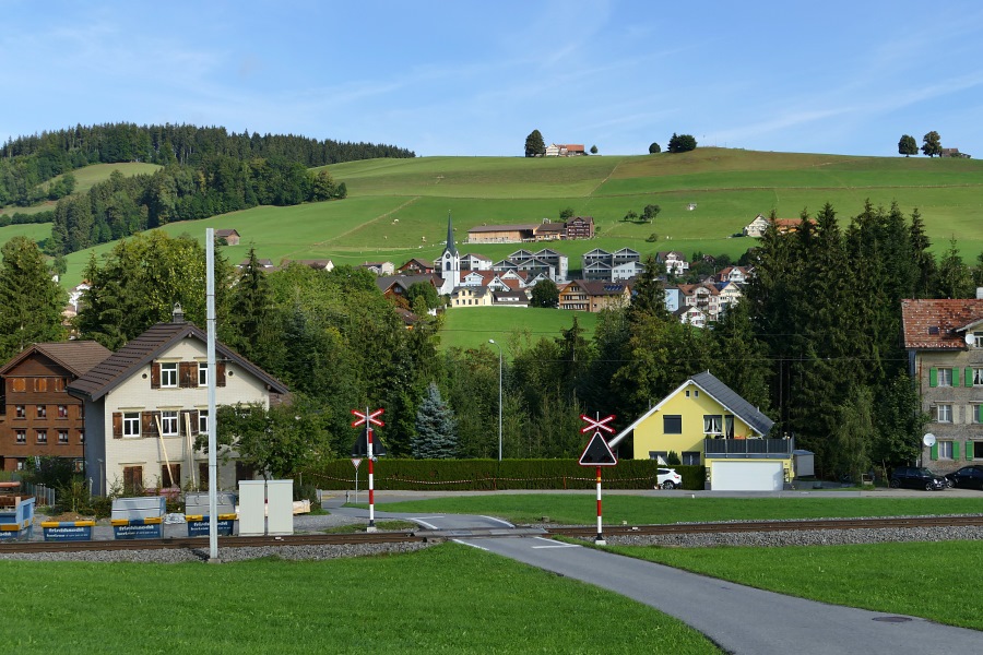 Am Bahnübergang bei Waldstatt, dahinter einer der typischen Appenzeller Hügel.