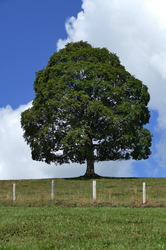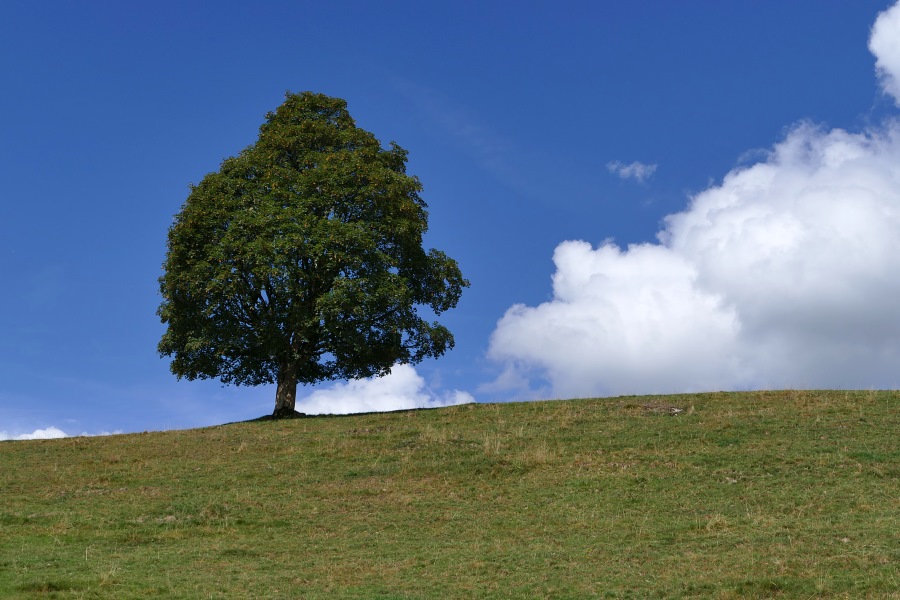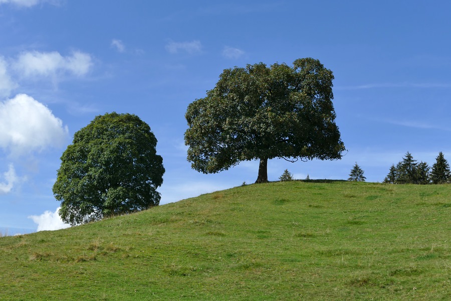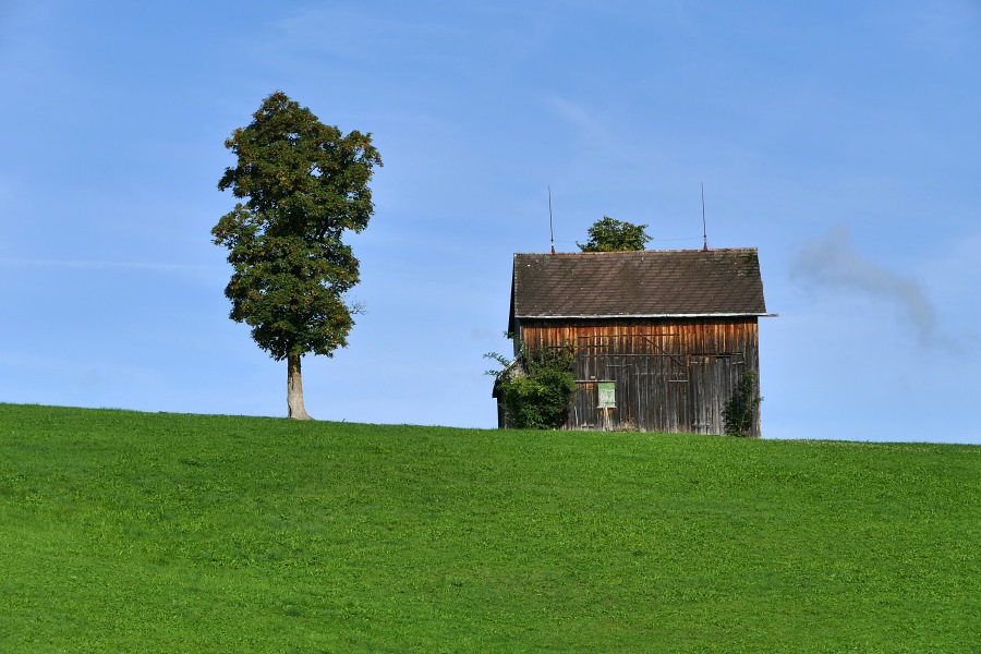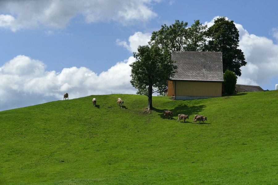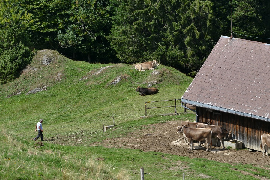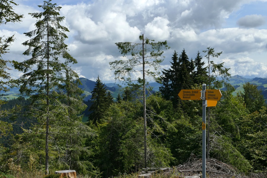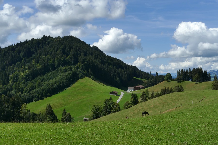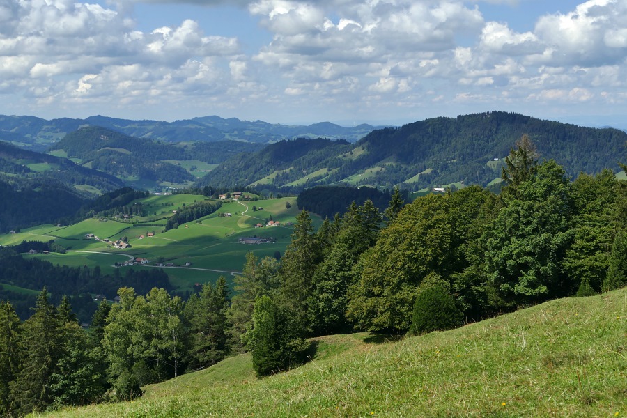 Taleinschnitt bei Tüfenberg. Auf der anderen Seite beginnt der Anstiegsweg zum Hochhamm. Zunächst über Wiesen, dann durch lockeren Wald, in dem viele reife Brombeeren nur darauf warten, gepflückt und als Dessert verzehrt zu werden..